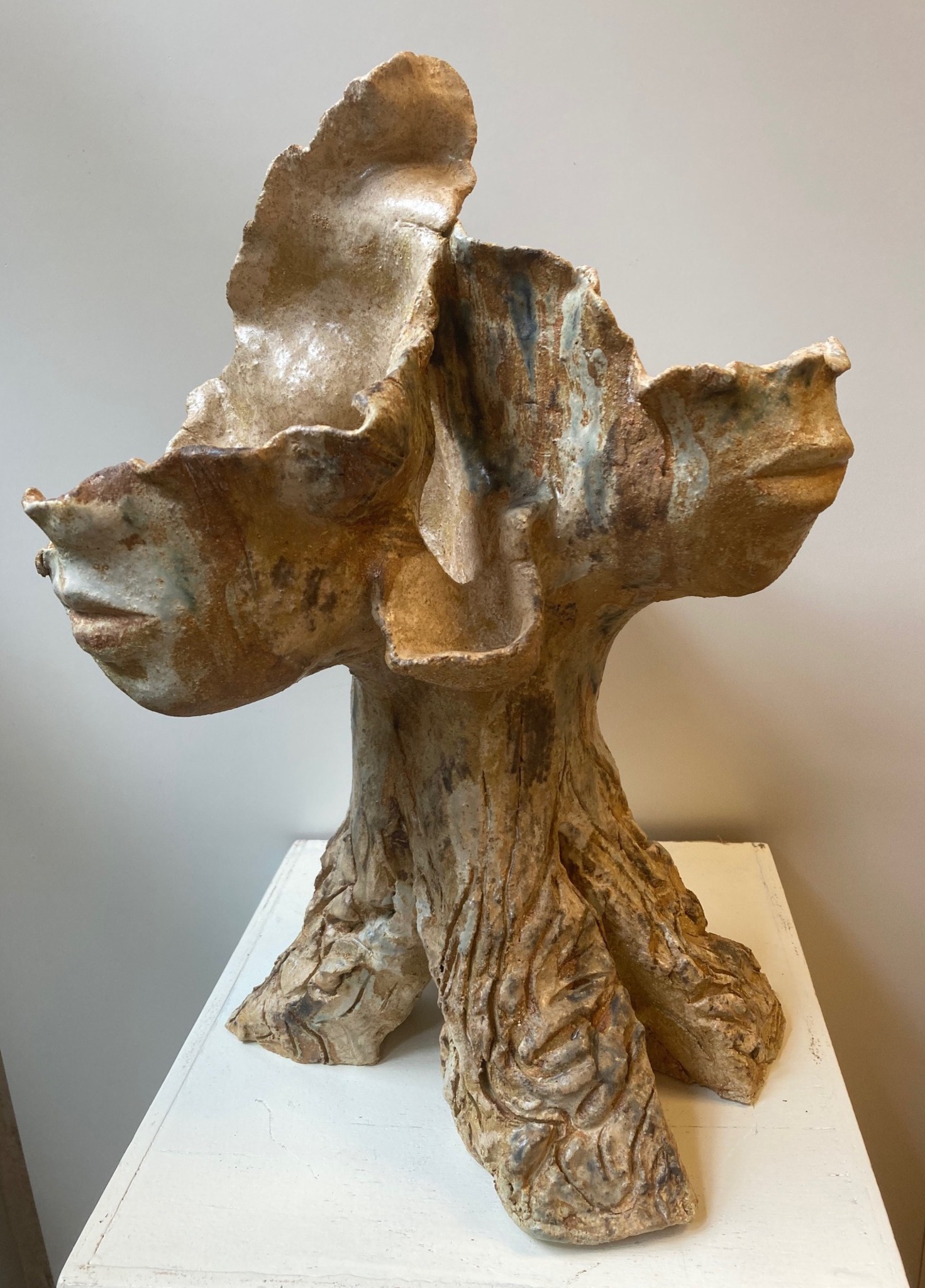 Beeld van klei, abstract. Natuur. Boomachtig vorm met onderdelen van gezichten. Het beeld is hooggestookt , d.w.z. het beeld kan buiten en binnen staan. Kleuren bruin, oker, groen, wit. Materiaal: Klei, glazuren, oxydes. Tegen meerprijs kan het beeld op een (bijv stenen) sokkel gemonteerd worden.