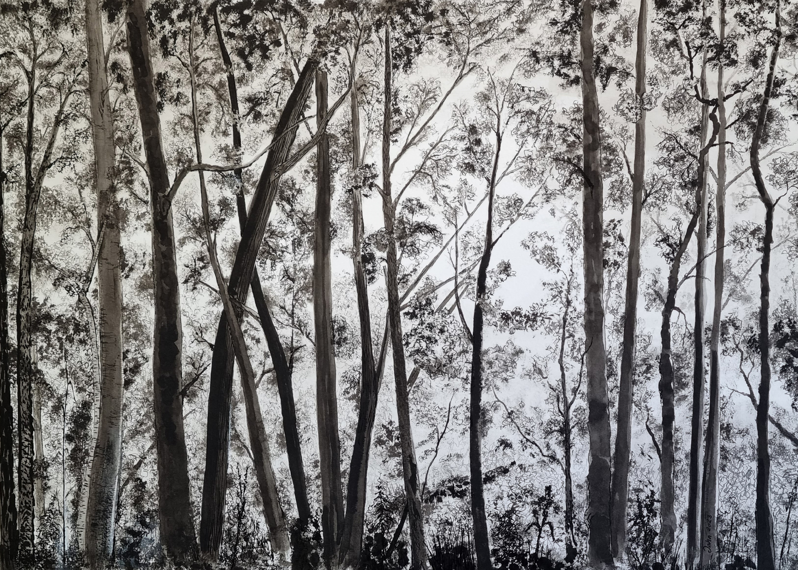 Sfeerimpressie van bosschage nabij het Emile Van Dorenmuseum in Genk, België. Uitgevoerd op Steinbach aquarelpapier, gebruikmakend van diverse inkttechnieken: pen, penseel en wassing van inkt.