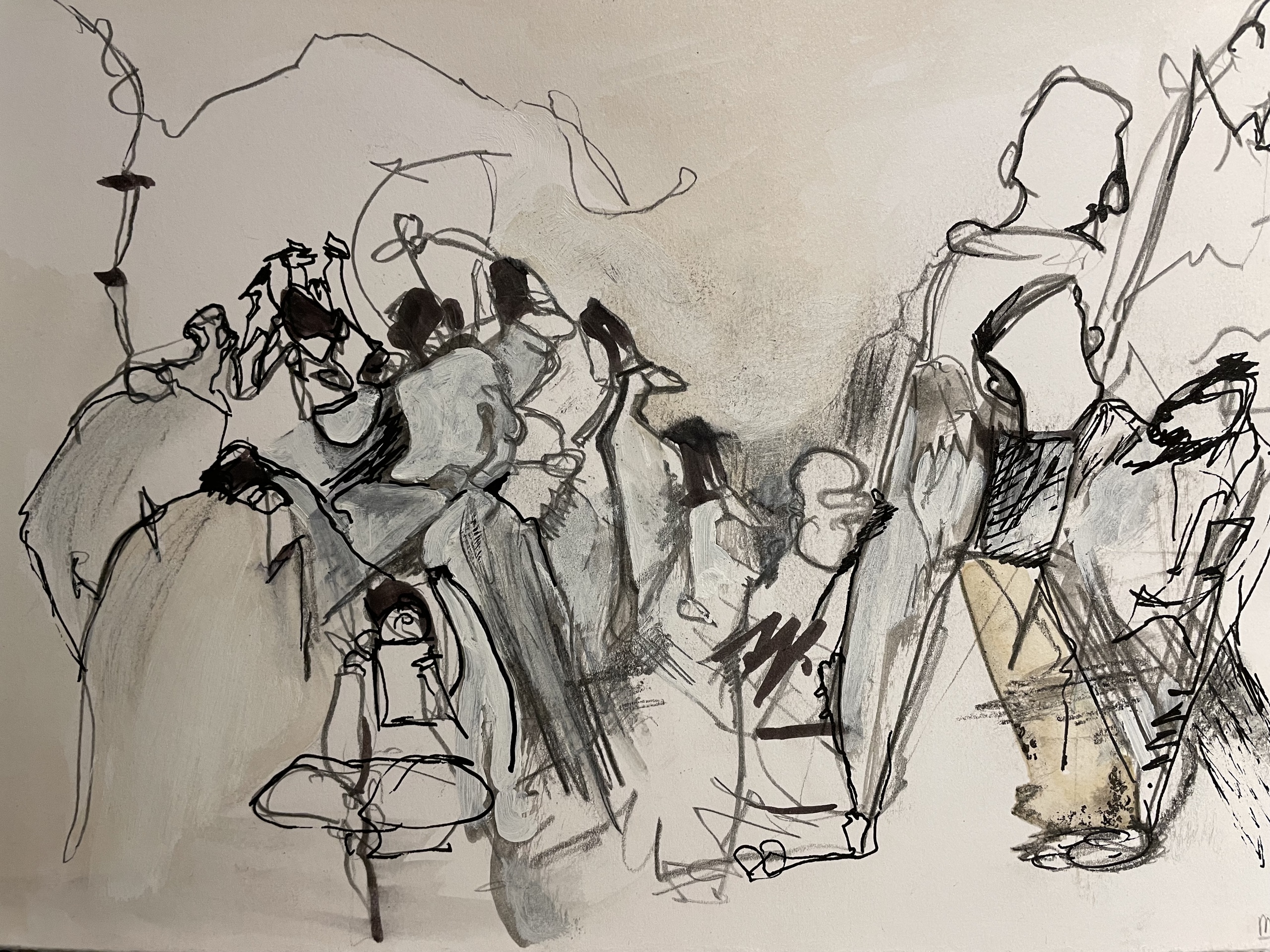 Mixed Media Papier Tekening Crowdscape
