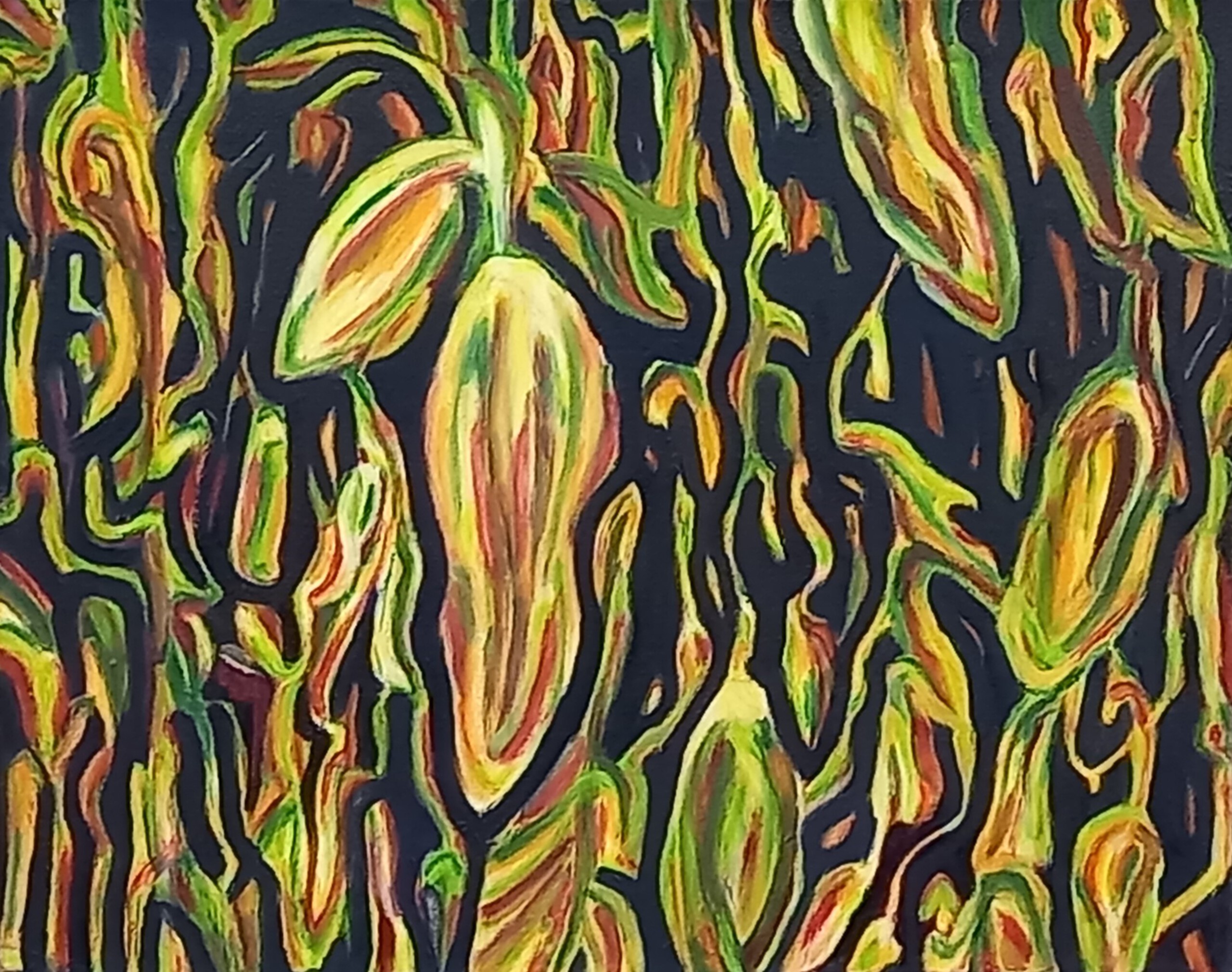 Vorig jaar, toen er ook in Nederland en België er echt een droogteperiode was, heb ik meerdere foto's gemaakt van uitgedroogd gewas waaronder mais. Hier is dit schilderij op gebaseerd.