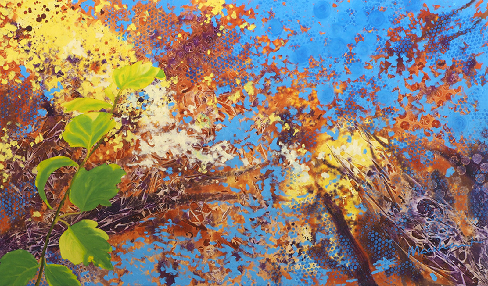 Dit schilderij is geïnsprireerd op het beeld wat ik in een greppel in het bos zag. Spetterend met sterk verdunde verf bracht ik met een afwasborstel al zegenend kleur aan op het doek. Verder heb ik verschillende folies gebruikt om mee te stempelen en voegde ik bladgoud toe.