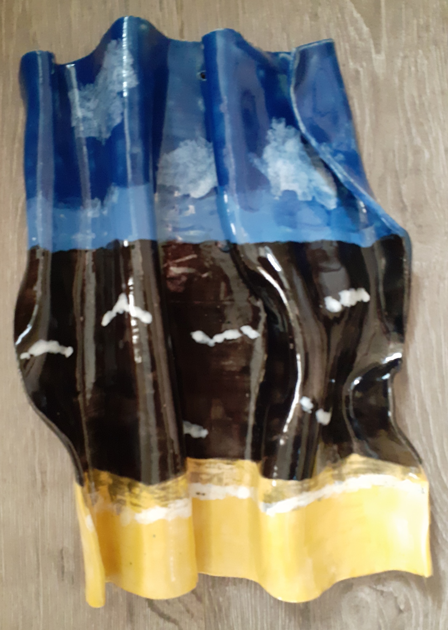Dit werk is een wandsculptuur gemaakt van keramiek. het is een zeelandschap.