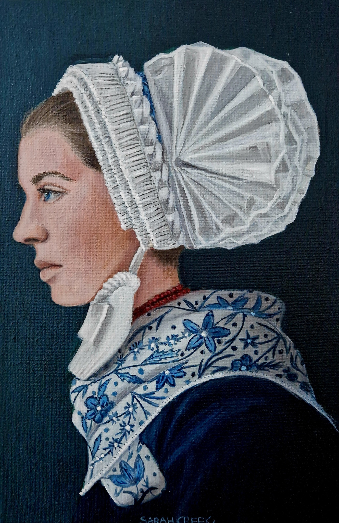 Sarah Creek schildert met acryl op canvas of linnen. Onderwerpen zijn portretten en stillevens. Sarah geeft les aan 55 talentvolle cursisten in een atelier aan huis.