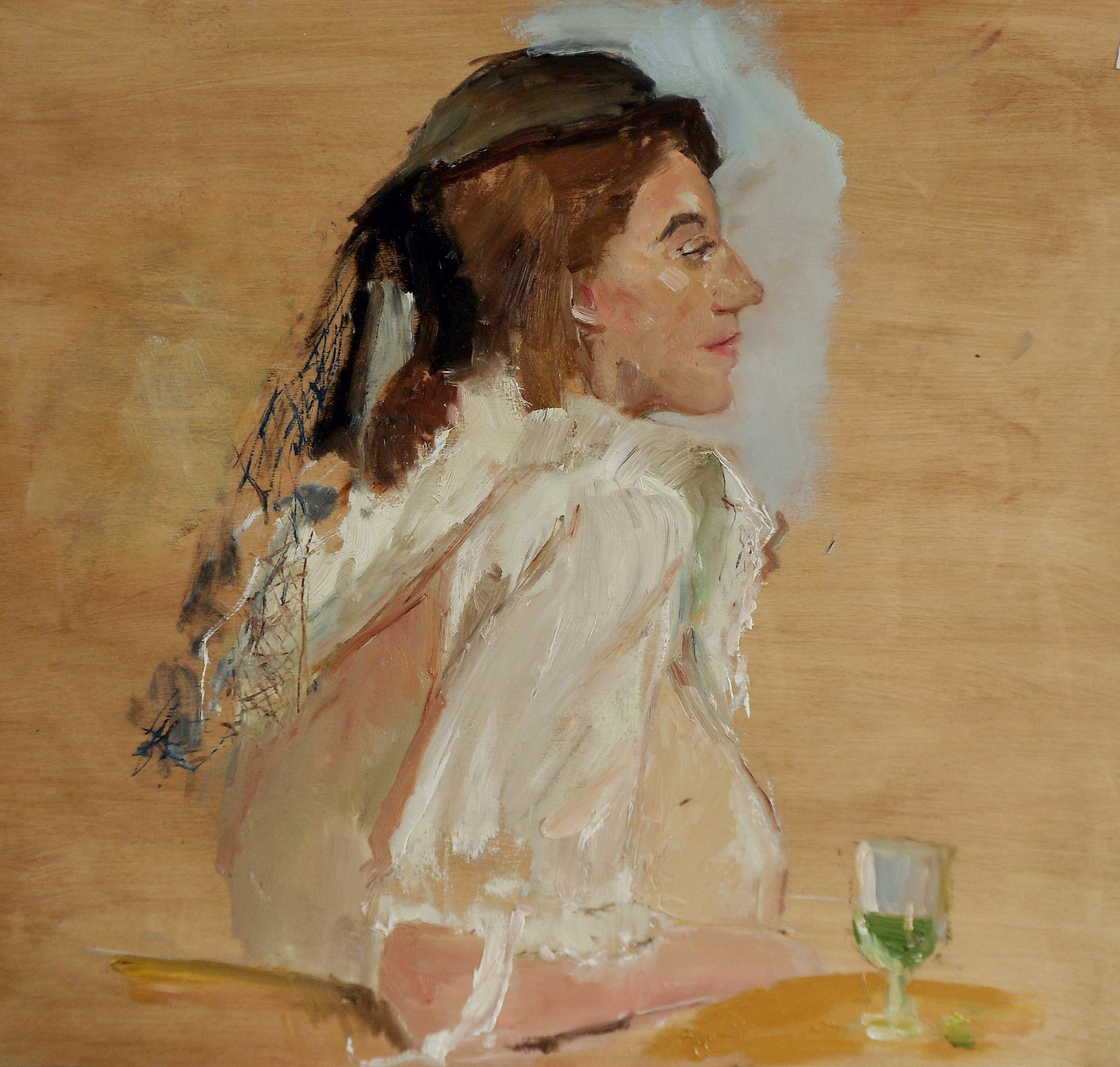 Eens per week doe ik mee met een kleine groep schilders die naar model werken met de nadruk op portret. Dit meisje poseerde in mooie tot de verbeelding sprekende kleding. Daar hoorde een glaasje absinth bij vond men. Een drankje dat ook tot de verbeelding spreekt wegens allerlei eigenschappen die er-nog altijd- aan toegeschreven worden. We hadden het niet in huis. Dan maar afwasmiddel in het glas, het gaat tenslotte om de illusie.