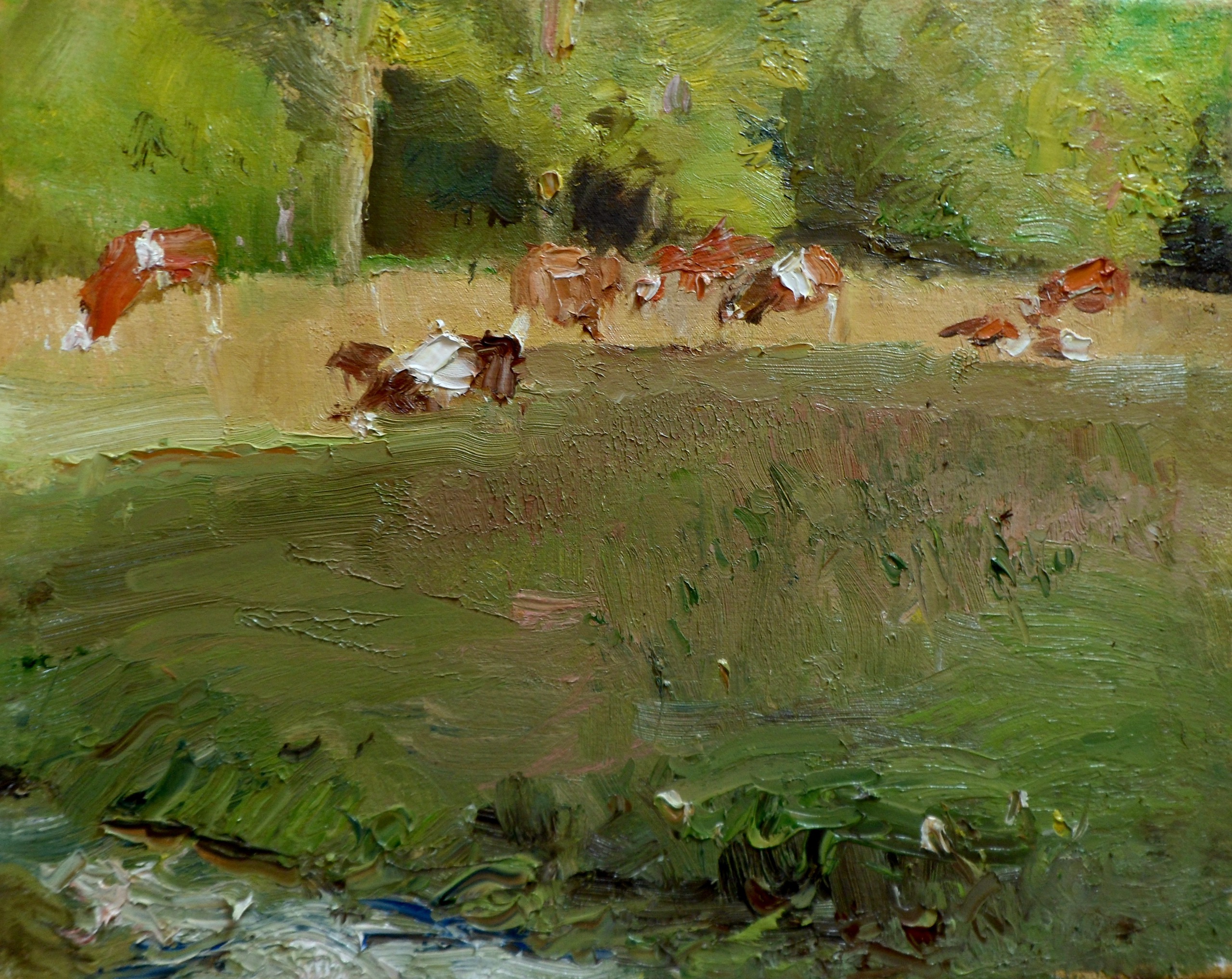 Een weide met koeien geschilderd tegen het vallen van de avond. Plein air zoals altijd.