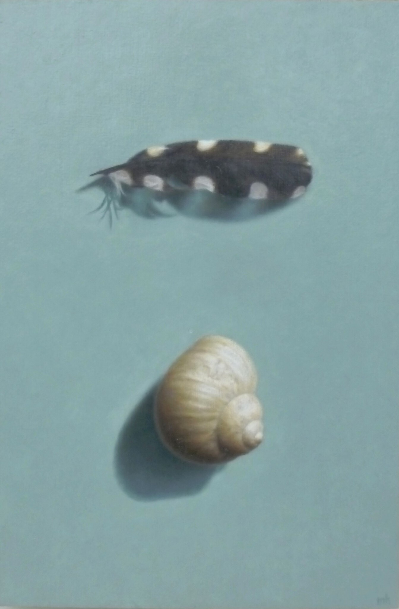 Schelp en veer van een bonte specht