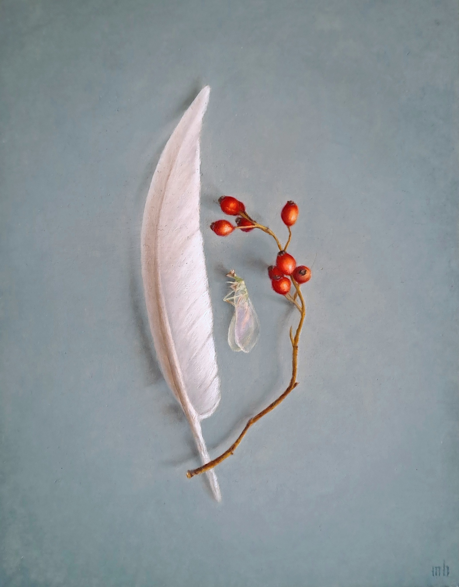 Realistisch Olieverf Stilleven Insect Rozenbottels Ganzenveer