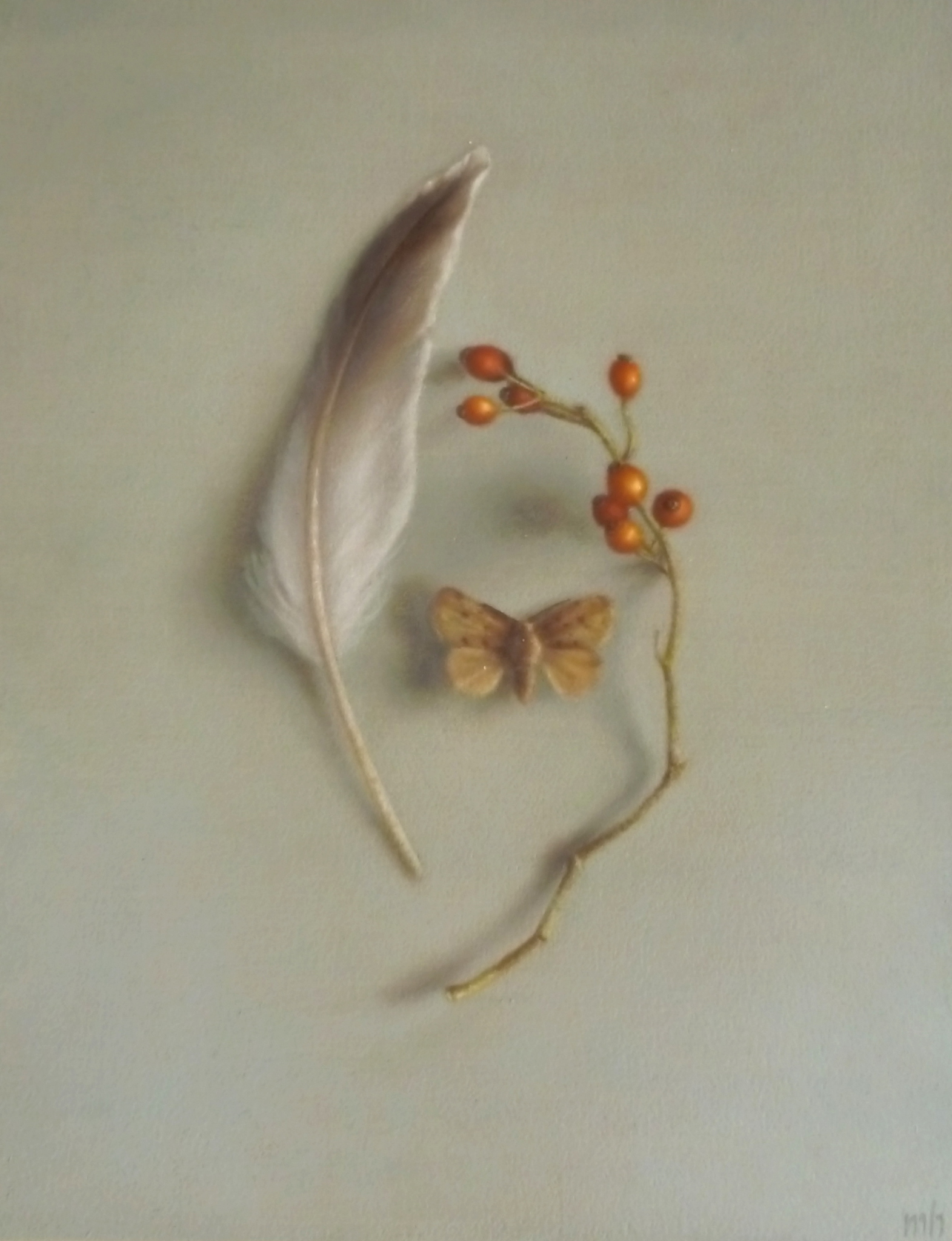 Realistisch Olieverf Stilleven Veer Rozenbottel Mot