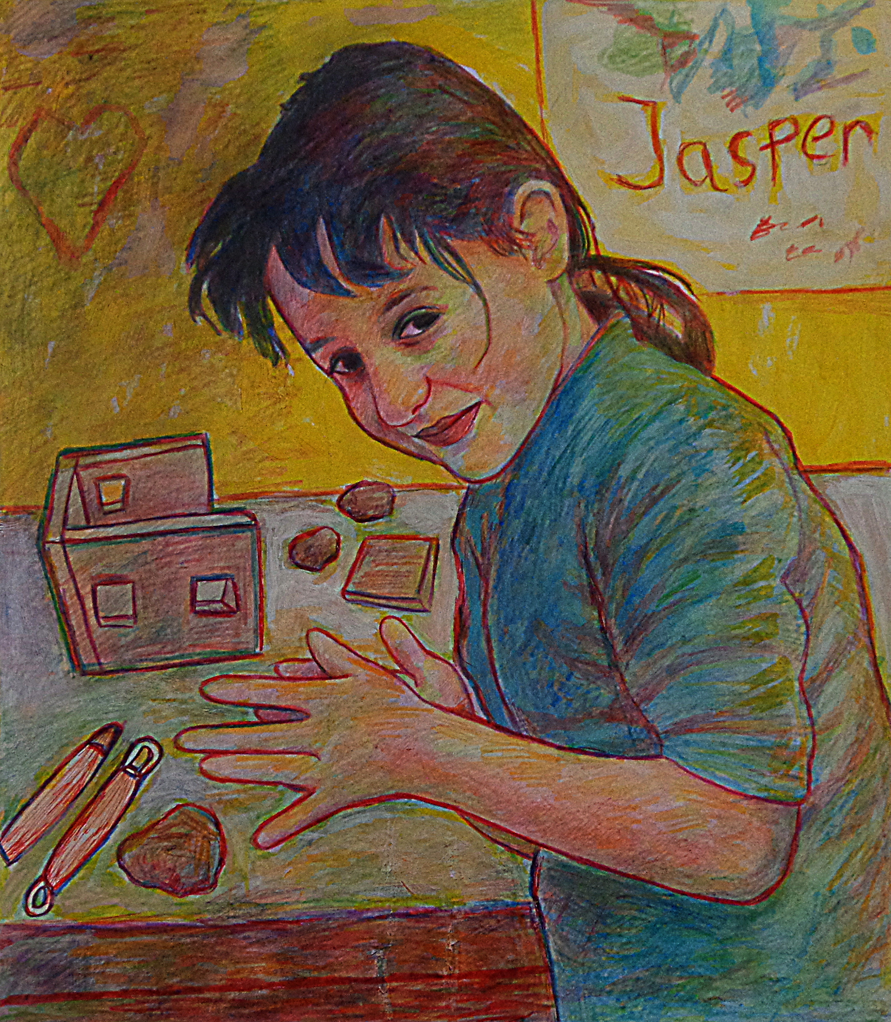 Vrij werk in ballpoint kleurpotlood en acrylverf