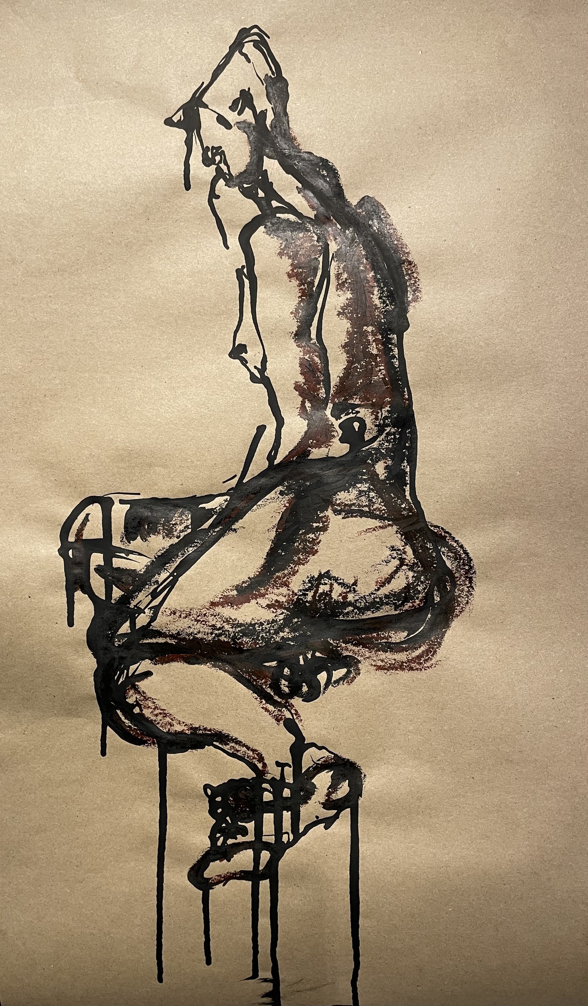Inkt en oliepastel op bruin tekenpapier.