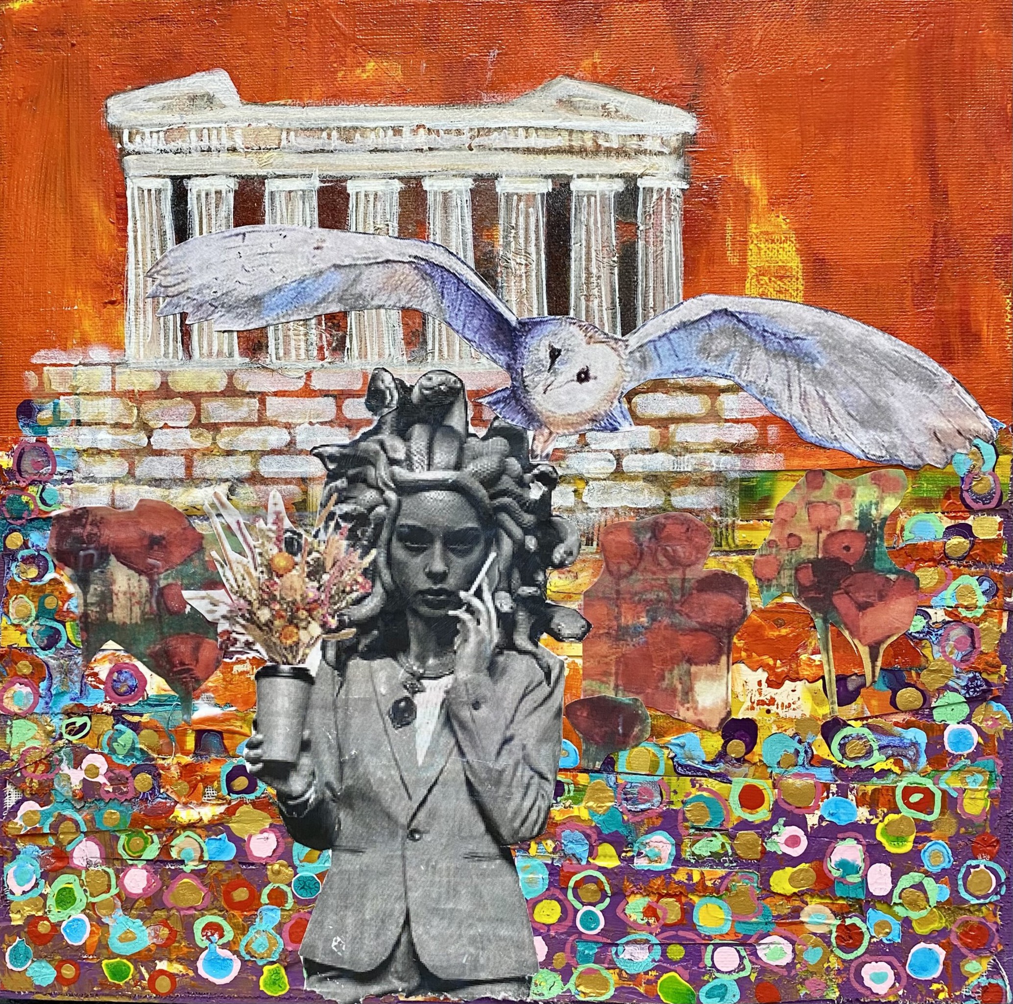 Medusa afgebeeld als hedendaagse carrièrevrouw met de attributen van de godin Athena (uil, parthenon).