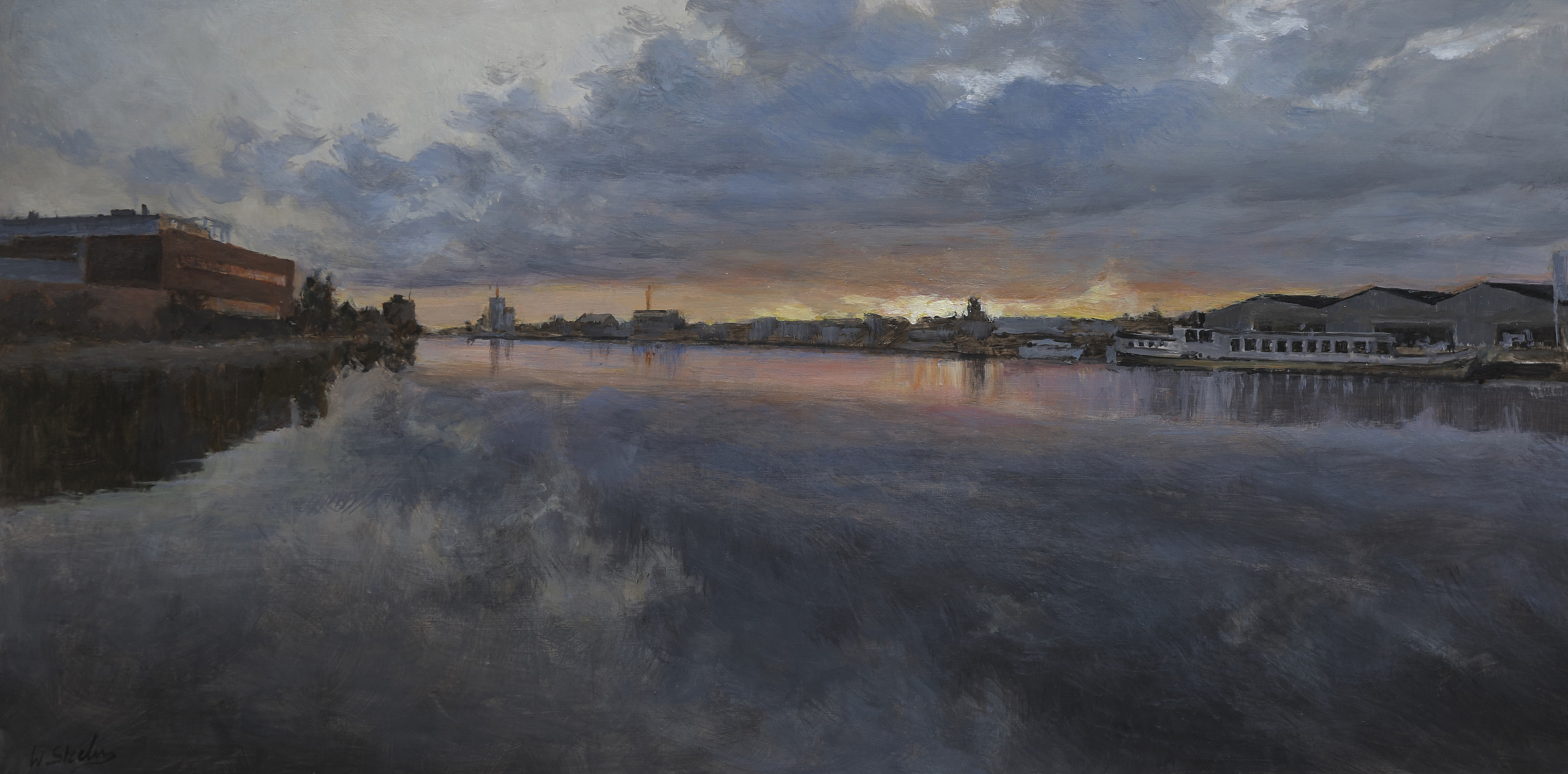 Grijs Oranje Wolken Zonsondergang Boot Fabriek