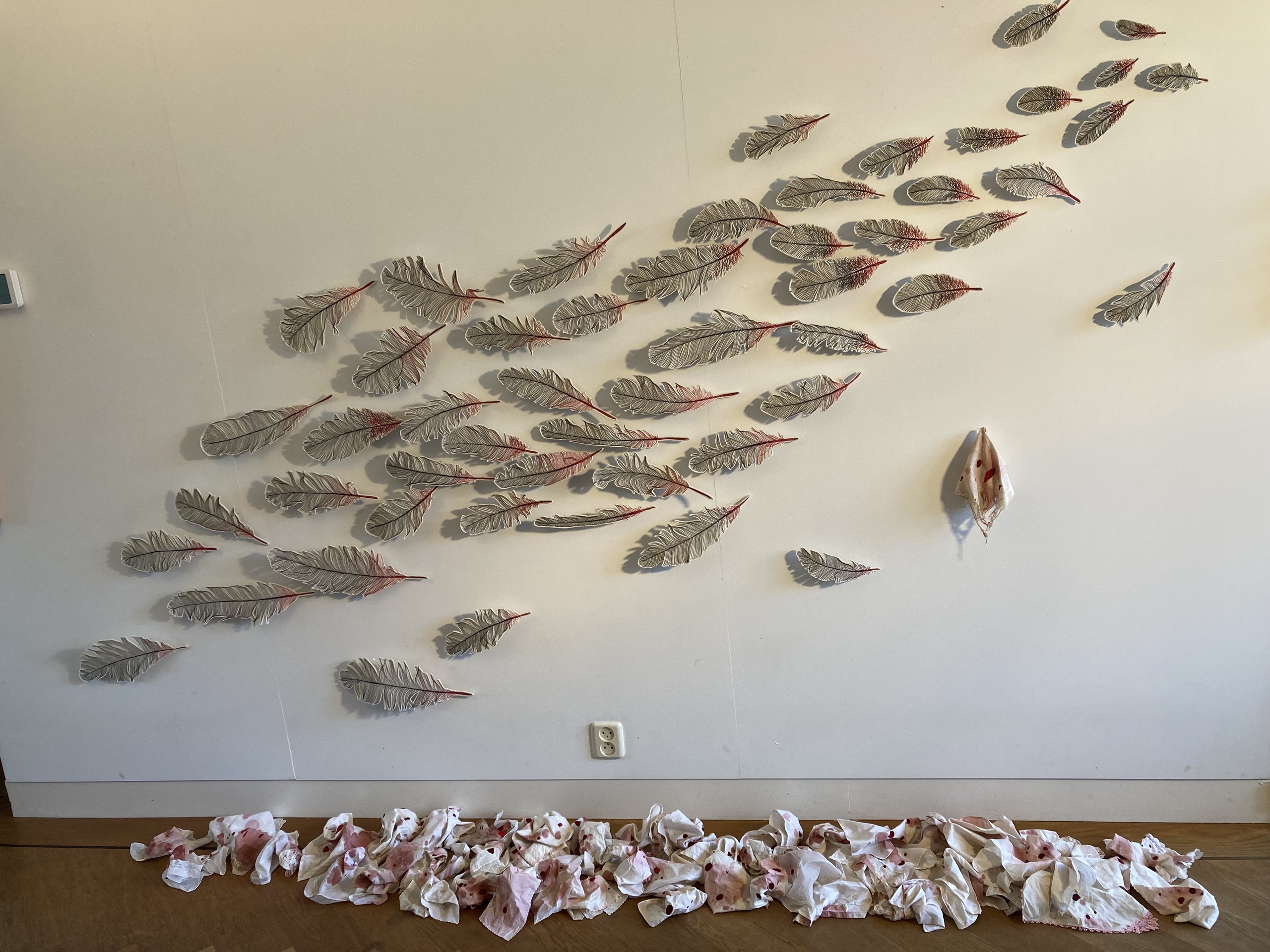 Verlies van onschuld: Deze installatie is een aanklacht tegen verkrachtingen en een ode aan alle vrouwen die verkracht zijn en hierdoor hun onschuld zijn verloren. De eend is een symbool van onschuld. Daarom gebruikte ik de veren als een symbool voor het verliezen vn de onschuld. Uitgerukte veren besmeurd met bloed. En heel veel bebloede zakdoeken voor alle pijn en trauma's die de vrouwen zijn aangedaan. Over de zakdoek met de knoop: Ik heb een hoek van de zakdoek ontrafeld en vervolgens in de wasmachine gedaan zodat er een natuurlijke knoop is ontstaan zoals de ziel van de vrouw die misbruikt is.