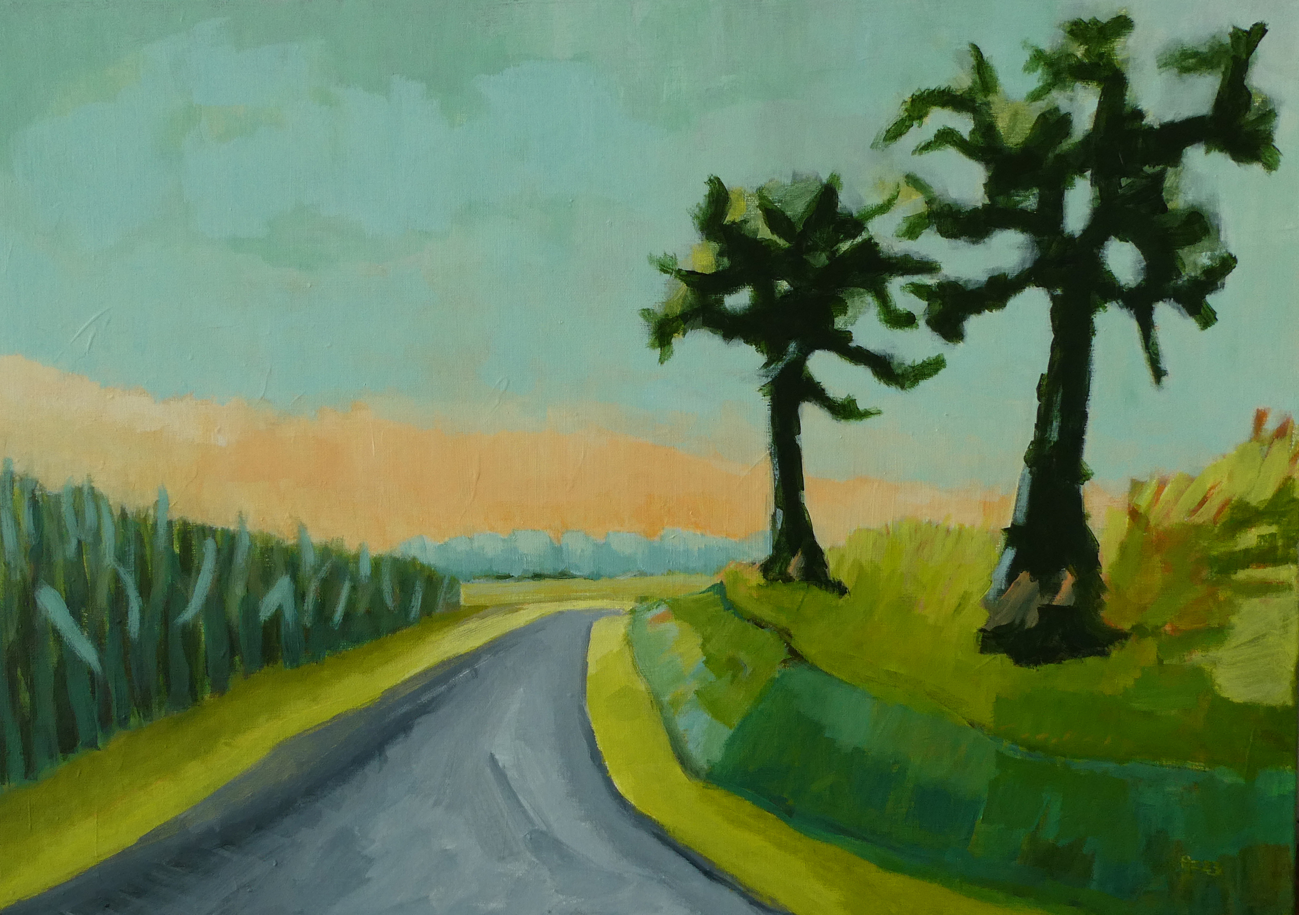 Nog een klein tochtje tegen de avond. De lucht kleurt rood. Twee malle bomen langs de weg.