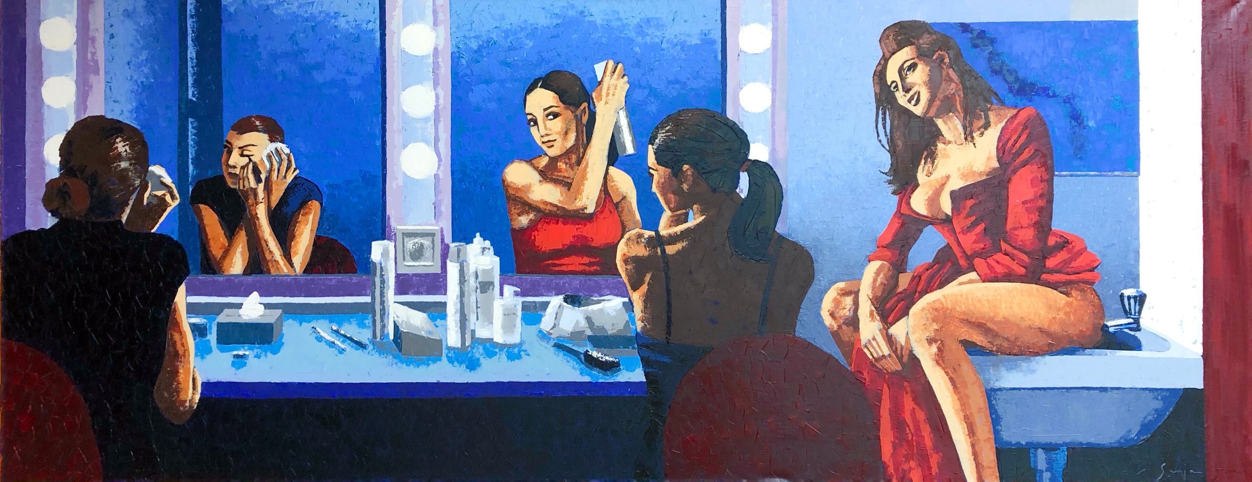 Sasart Coulissen Theater Backstage Actrice Wasbak Makeup Opmaken Toneelstuk Acteur Acteren Olieverfschilderij Kleurrijk Paletmes