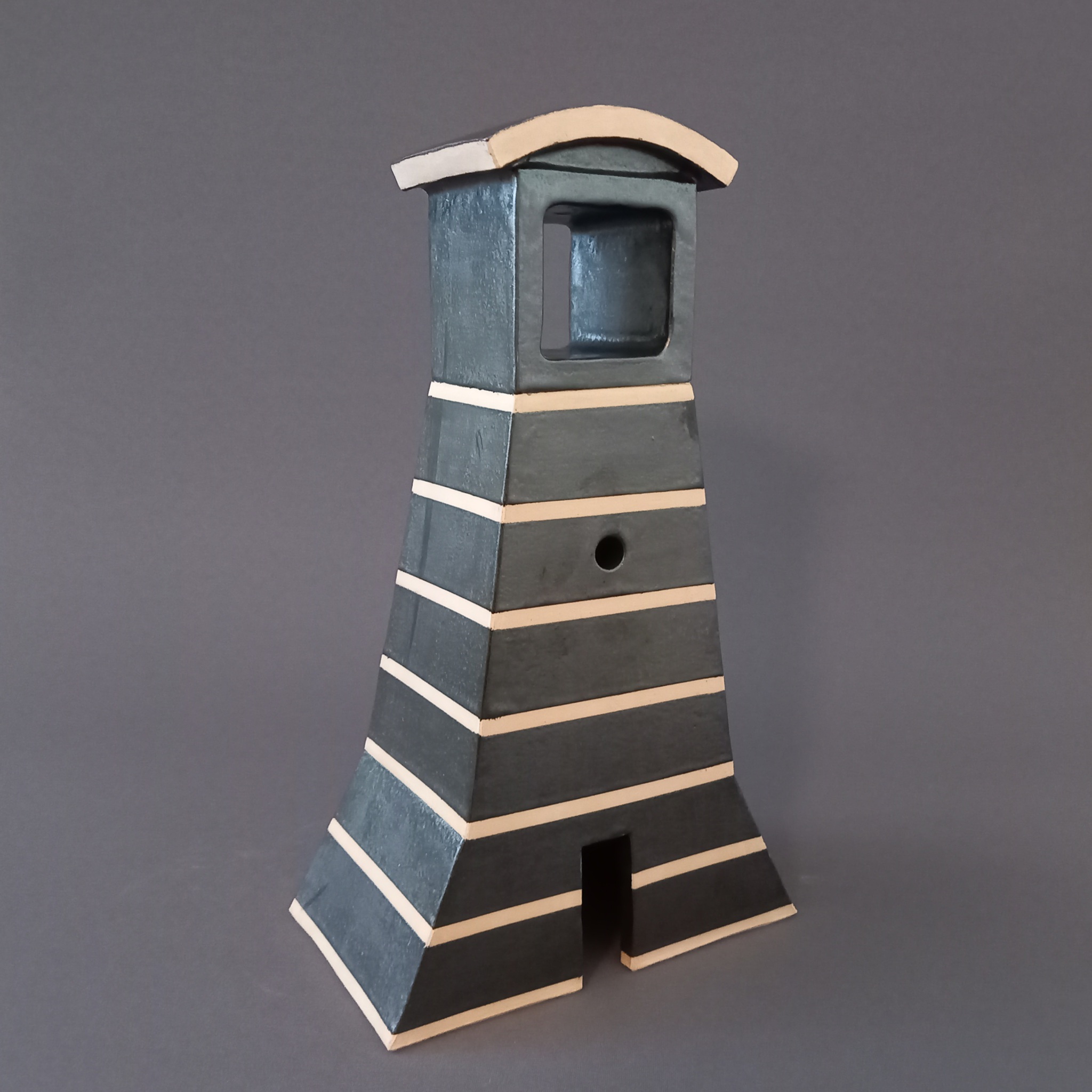 Geïnspireerd op de zwarte torens voor de zoutwinning in Boekelo. Nu in witte klei met zwart "olievlek"-glazuur en horizontale witte "banden".