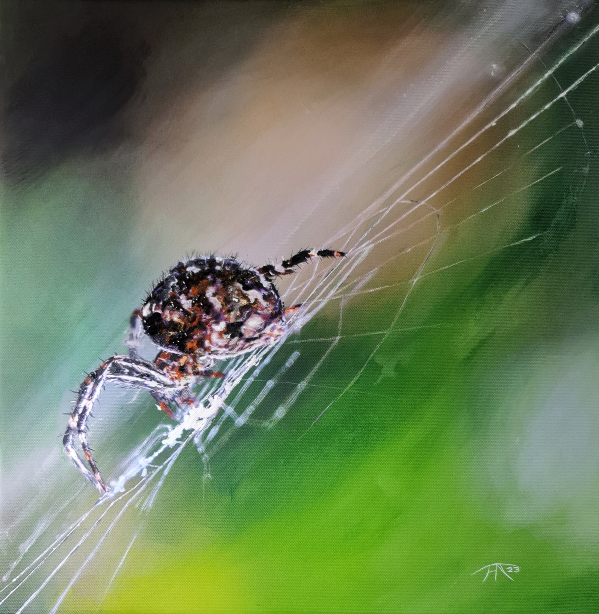 In 2013 volgde ik een fotocursus in het fotomuseum in Rotterdam. Als huiswerk maakte ik een macrofoto met kleine scherpte diepte van een spin. In 2023 maakte ik daar een acryl schilderij van. Veel mensen fotograferen een spin loodrecht op het web. Nu loop je als het ware met de spin mee over zijn web. Ook de onscherpte van de voorkant van het web en de achtergrond vind ik mooi.