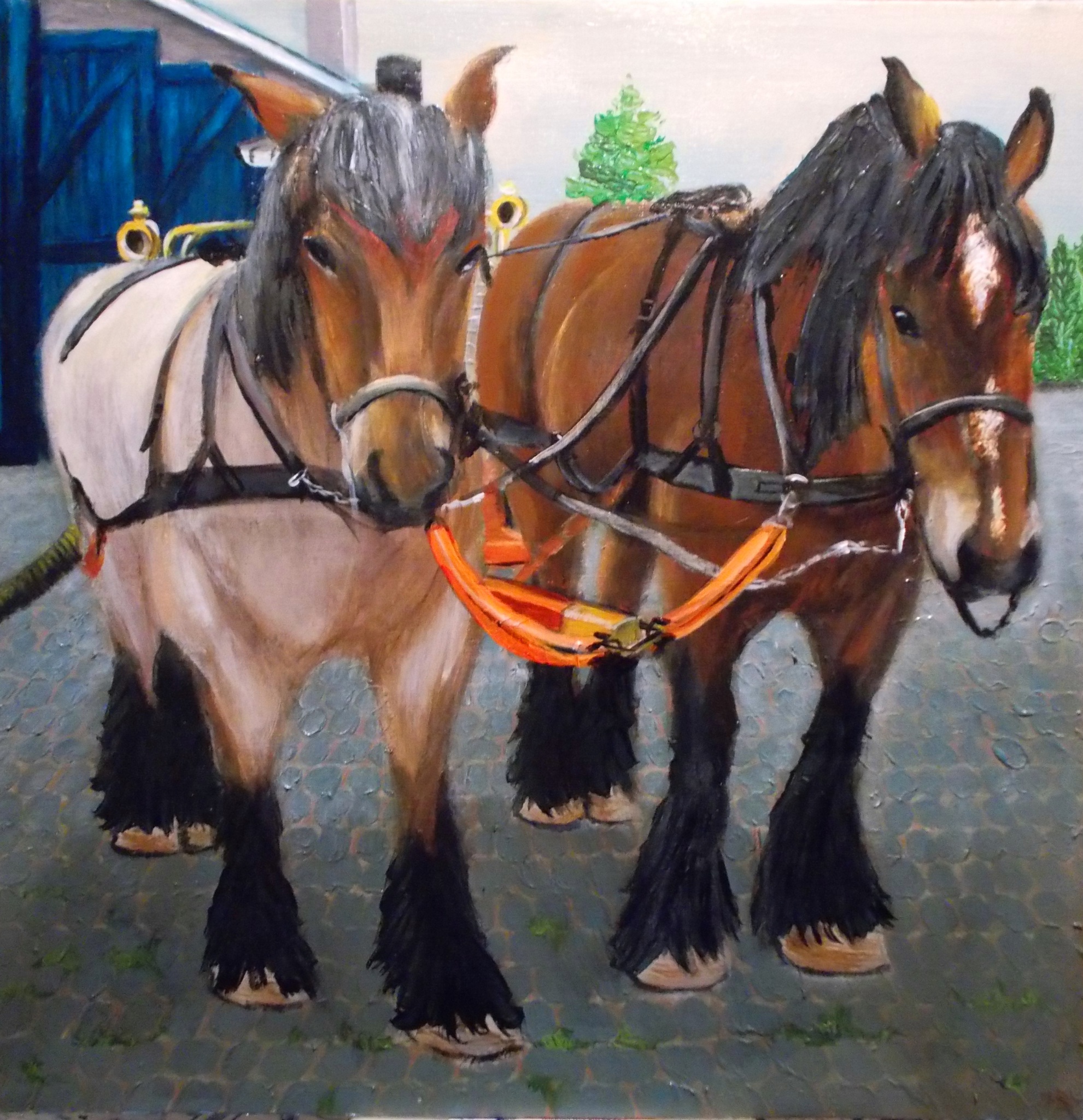 Twee shire horses opgesteld voor een antieke brandspuit. Geschilderd op 3D-paneel. Bruikleen aan: griffie, stadhuis, Den Haag.