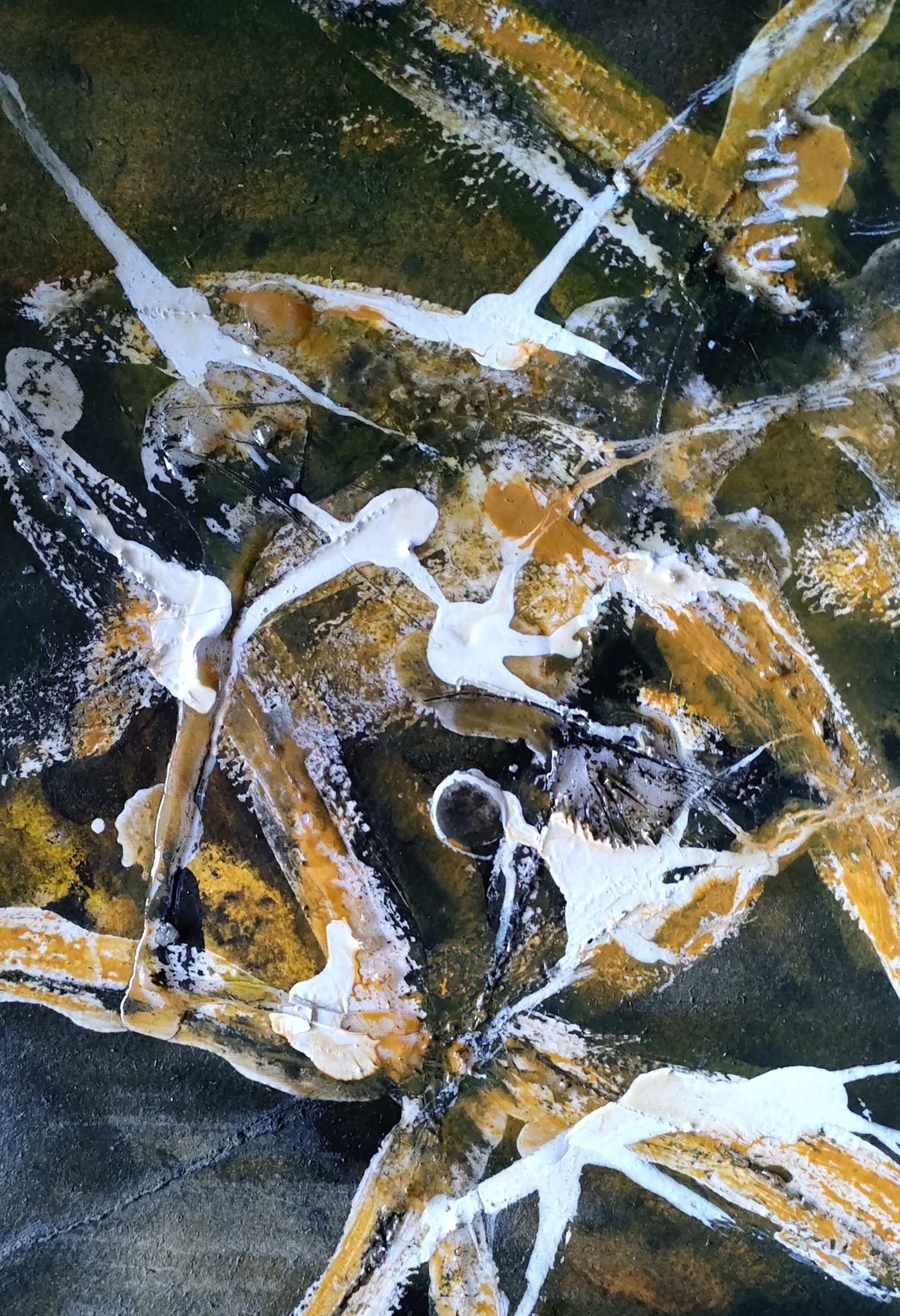 Dit werk is abstract, aardekleuren, ontstaan door met parafine, pigmenten en arabisch gom tie werken.