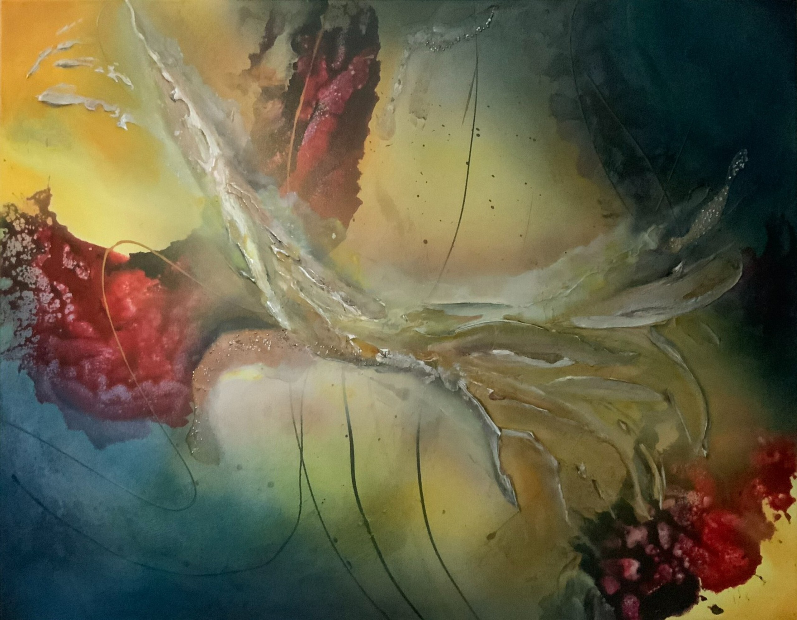 Alternative perspectives (90x70cm) Mixed media op basis van acryl, op canvas, 90cm x 70cm x 2cm. Perspectief wordt in de beeldende kunst meestal gebruikt om weer te geven hoe objecten kleiner lijken naarmate ze verder in de verte bewegen. Het voegt diepte en dimensie toe aan platte afbeeldingen. Denk aan een weg die je ziet, die verdwijnt in een stip aan de horizon. Alternatieve perspectieven op kunst, vooral abstracte kunst, kunnen ook een alternatieve interpretatie betekenen van wat je op een schilderij ziet. Zelfs hoe het schilderij moet worden opgehangen: welke kant naar boven, welke kant naar beneden. Normaal schilder ik met een duidelijke intentie hoe het opgehangen moet worden: het is duidelijk welke kant boven is. Soms schilder ik zodat het schilderij in Portrait of Landscape kan worden opgehangen. Mijn handtekening komt dan schuin te staan in een van de hoeken van het schilderij. Dit schilderij kan echter op 4 manieren worden opgehangen. Ik vroeg me af hoe ik mijn handtekening in dit geval moest zetten... Heb je het gevonden?