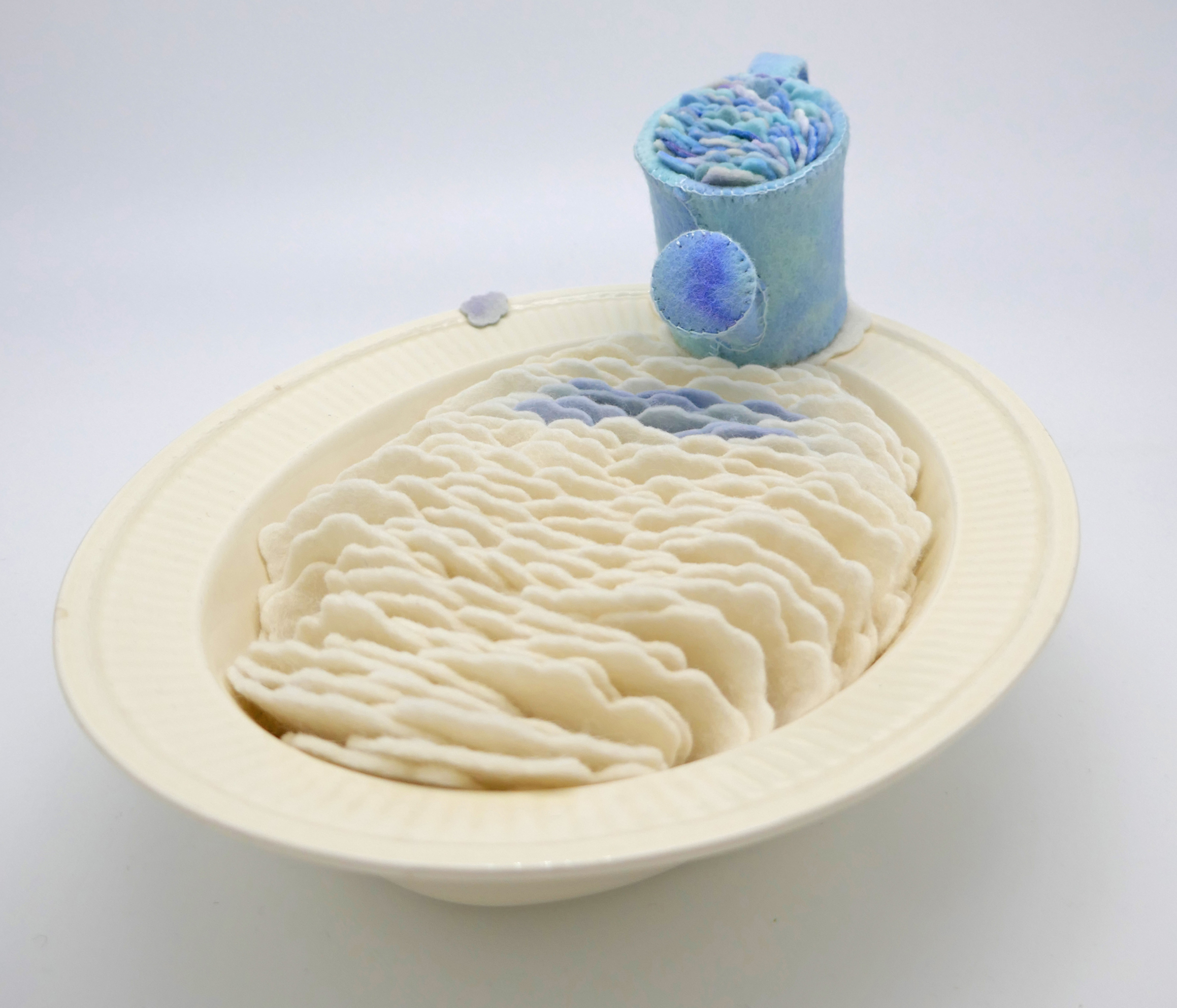 Deels handgeverfd wol vilt, kapot keramiek, zinken gietertje.