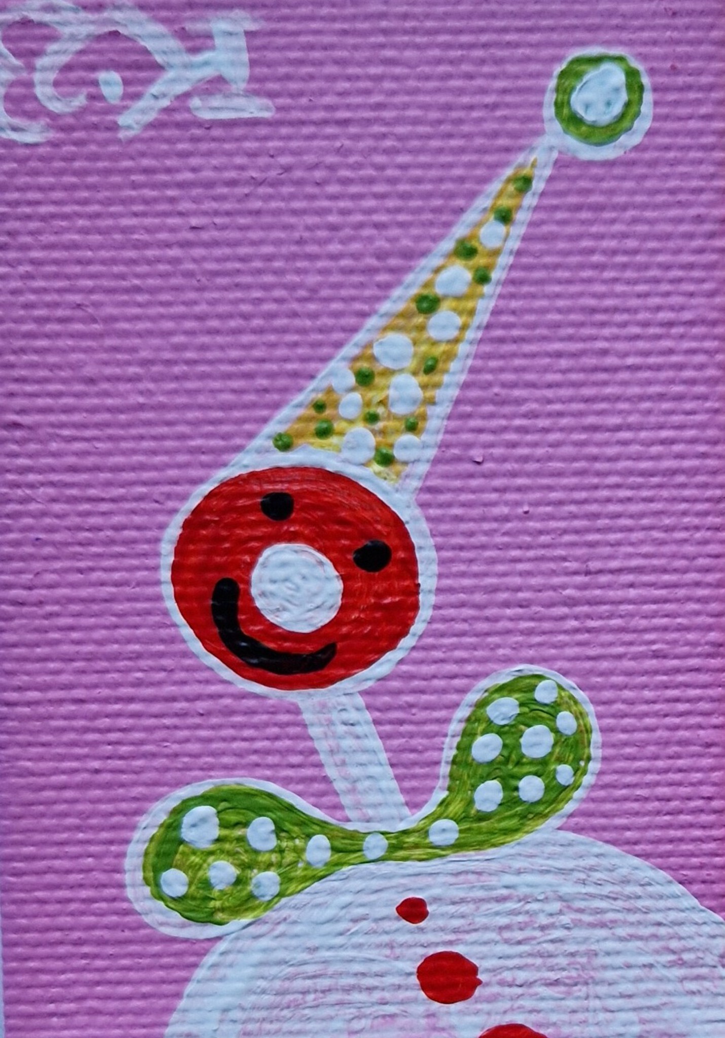 Minischilderijtje, 7 bij 5 cm, acrylverf op katoen, met ophanghaakje. De prijs is inclusief verzendkosten binnen Nederland. Als abonnee op mijn maandelijkse nieuwsbrief -zie linksonder bij 'contact'- krijg je bij aanschaf van dit werk 20% korting.
