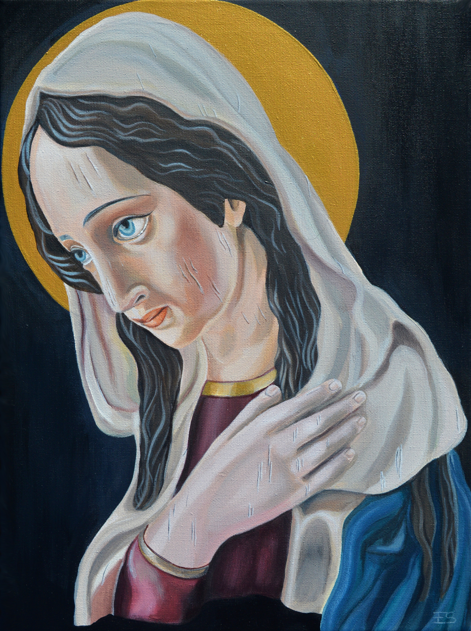 Voor Petra Botter heb ik dit schilderijtje gemaakt, als dank voor wat ze 24/7 voor de mensheid doet. Het is een afbeelding van een 'houten' beeld van Maria geworden.
