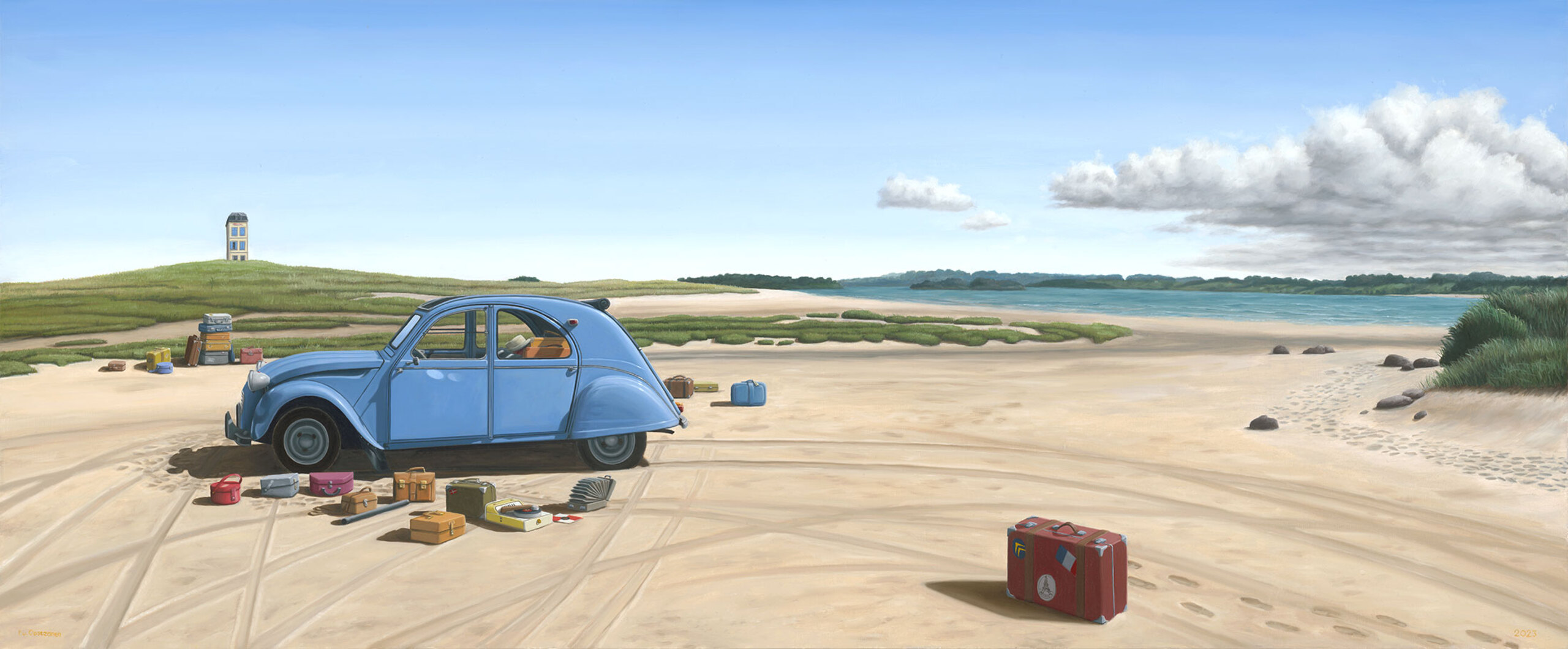 Een blauwe 2cv staat op een leeg strand geparkeerd. Boven op een duin is Hotel de la plage te zien. De oude citroën is omgeven door koffers. Veel koffers. Het strand is verlaten maar er zijn wel overal voetstappen te zien. Wat is er gebeurd?