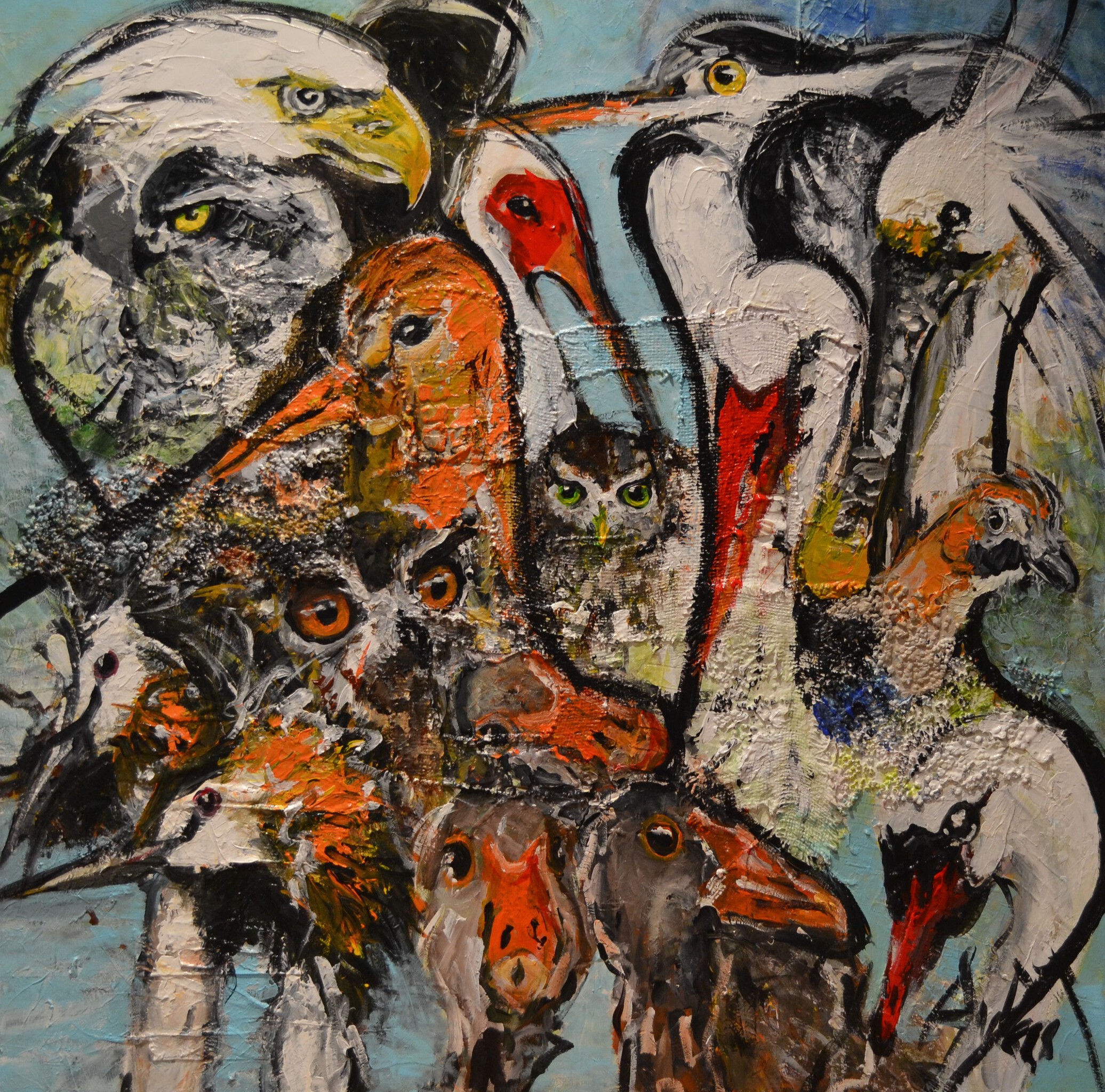 "Mooie veren" mixed media acryl op 3D doek zijkanten mee geschilderd