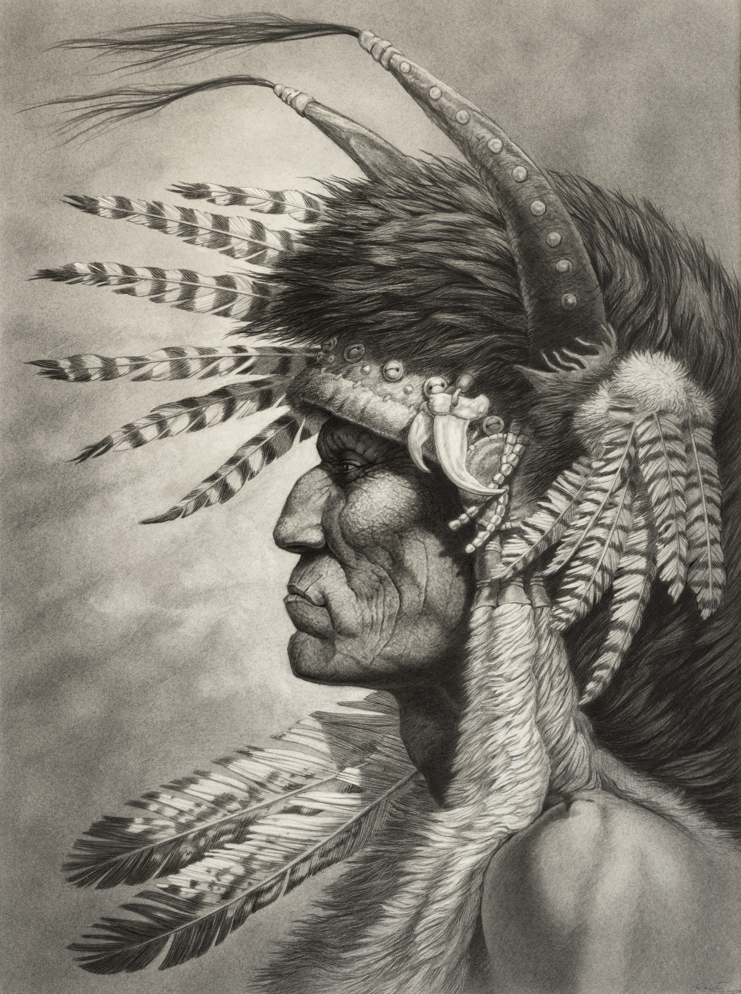 Grafiet/potlood tekening van een Comanche indiaan, gemaakt op aquarel papier 300gr
