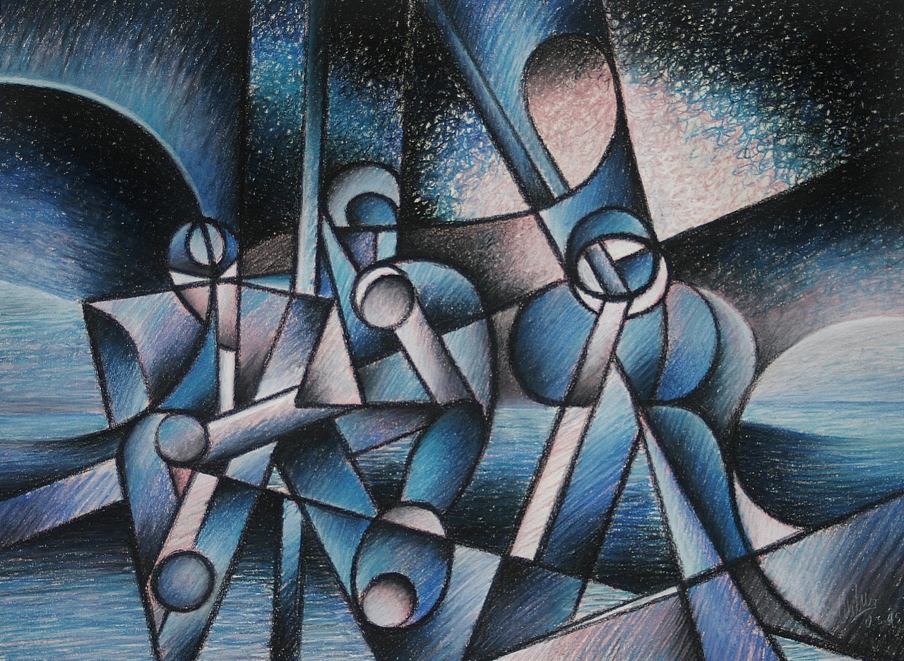 Blauw Paars Geometrie Contact Kubisme Dialoog Trio Confrontatie Drieéénheid