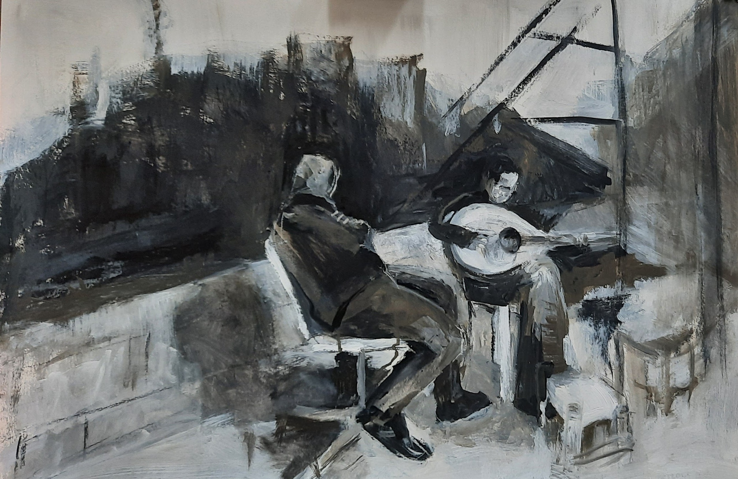 "Saz speler". Acrylverf op papier. 70x100 cm.