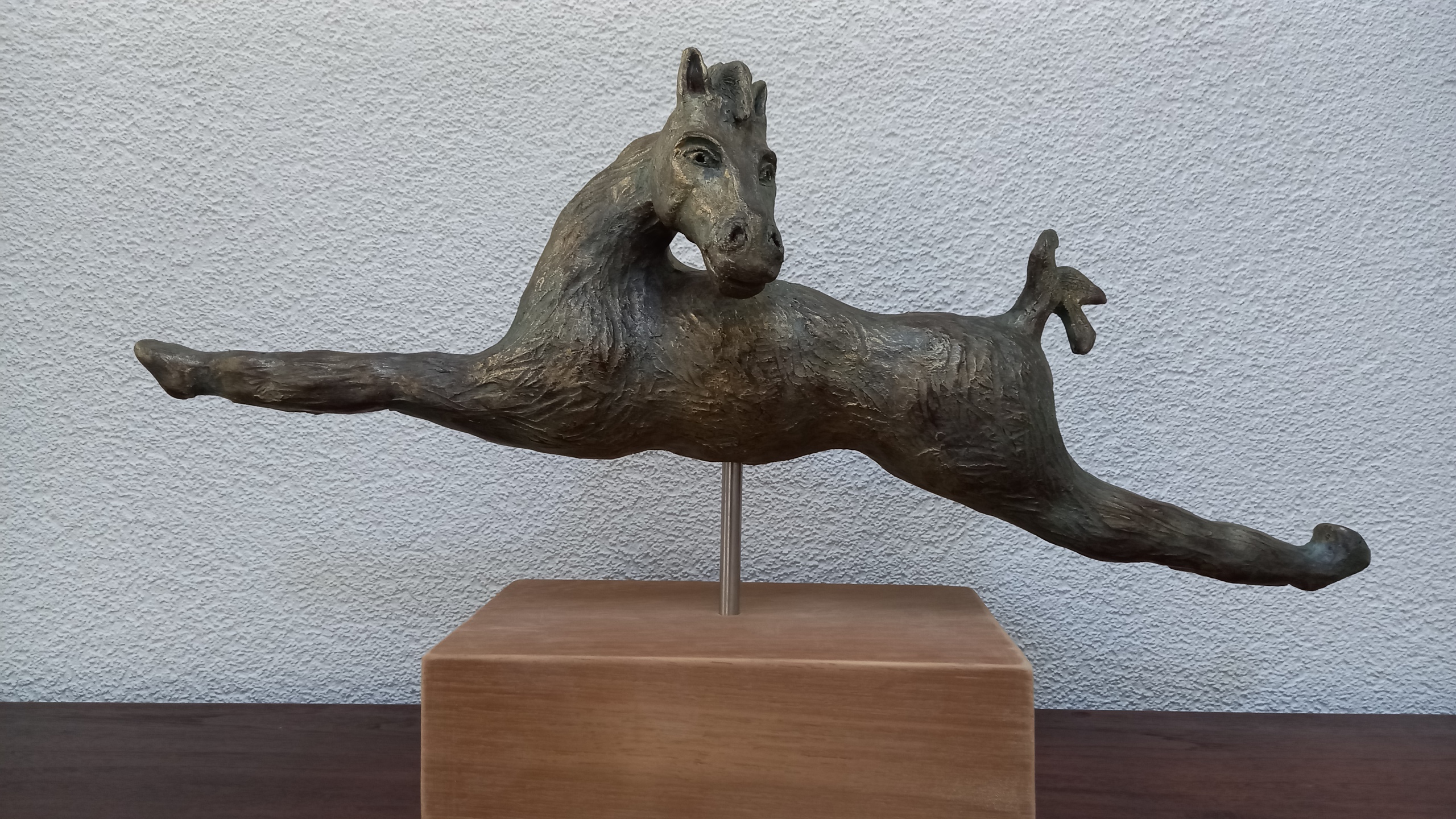 Paard in een onnatuurlijke dans/sprong. Keramiek en afwerking met acrylverf op een eikenhouten sokkel