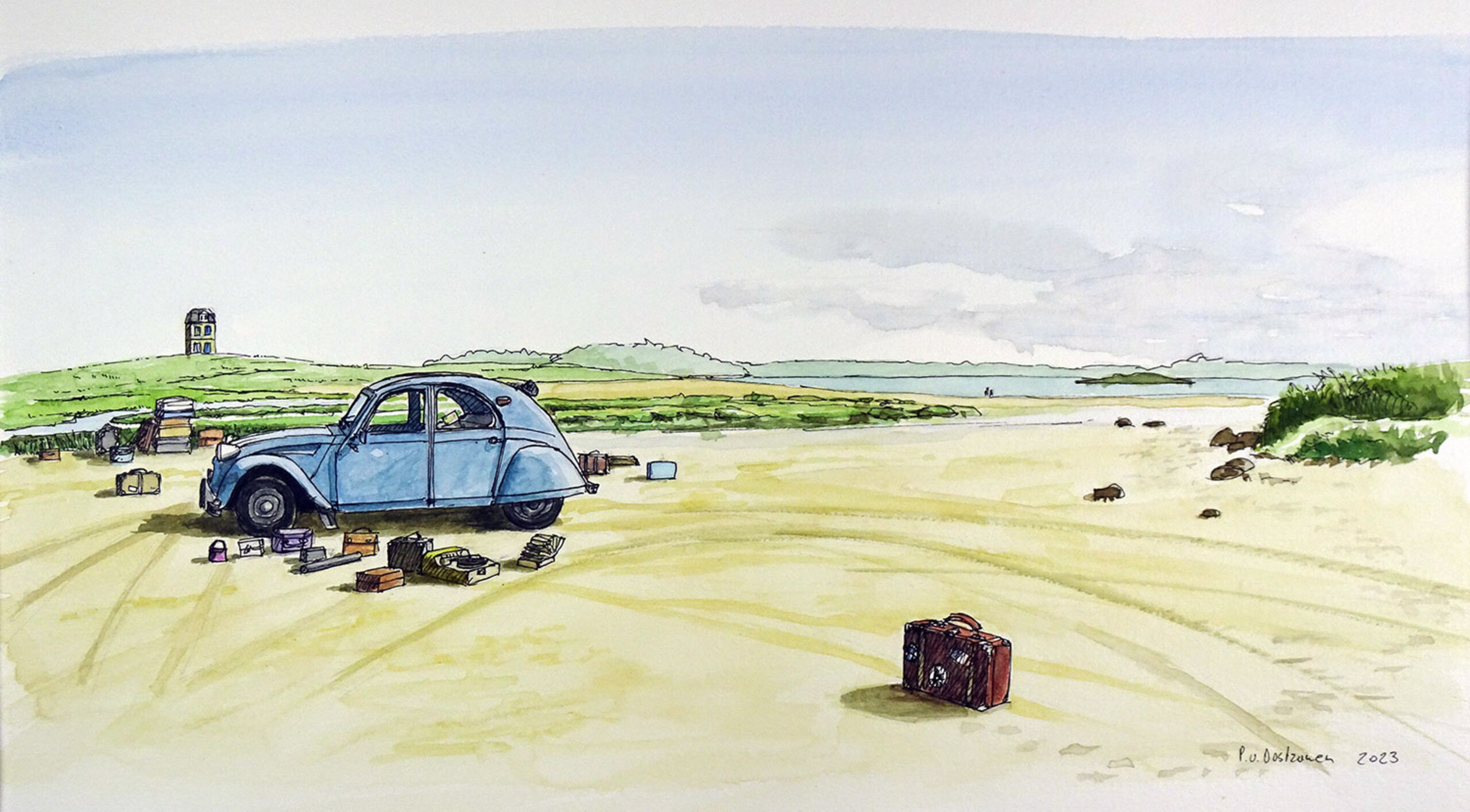 Aquarel tekening van Peter van Oostzanen. Omringd door koffers, staat op een verlaten strand een blauwe 2cv. In het zand staan overal sporen van voetstappen en auto banden. In de verte achter een duin is nog een hotel te zien Wat is hier gebeurd?