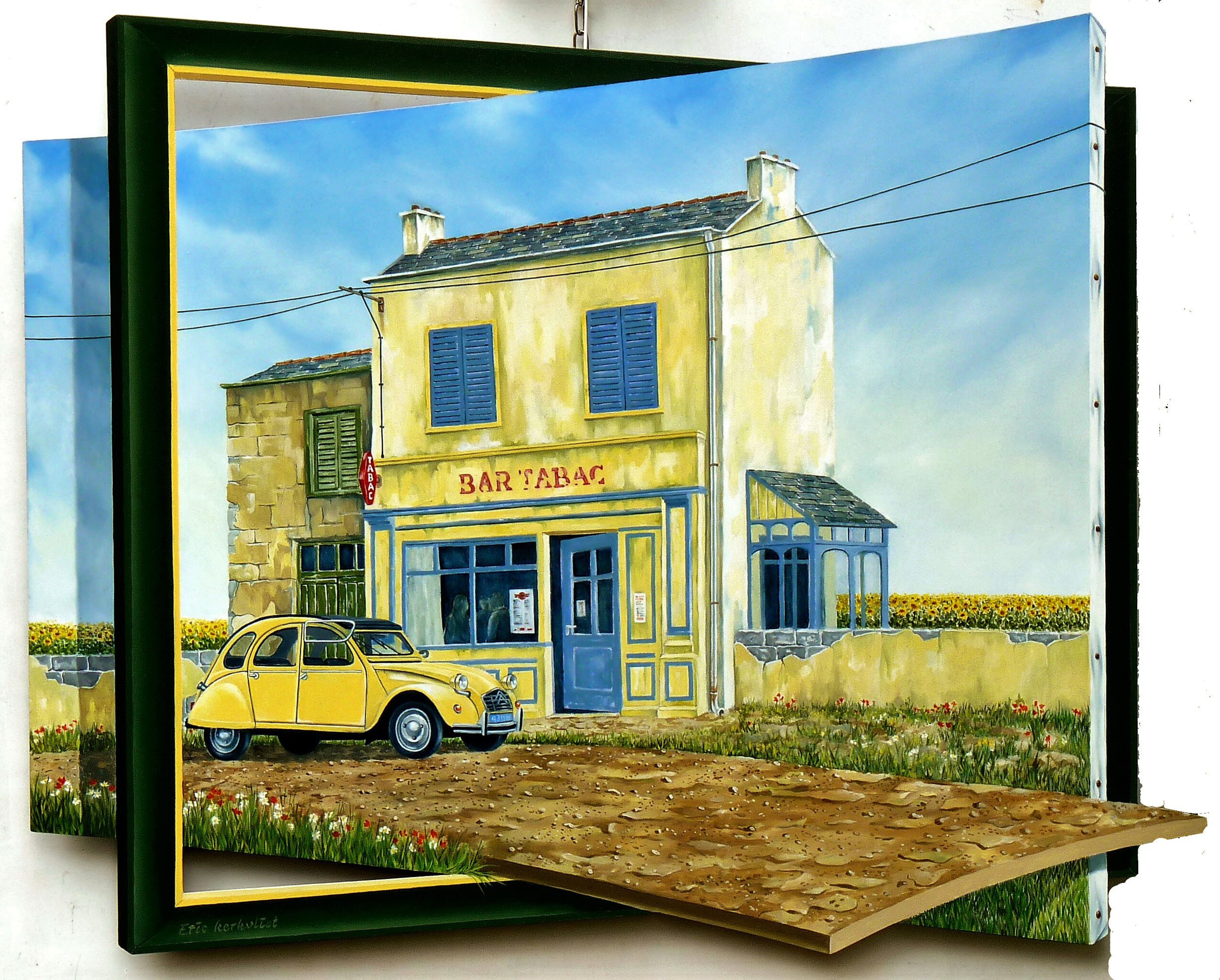 Eric Kerkvliet schildert met olieverf uiterst gedetailleerd voorstellingen op iets verhoogd paneel waardoor bij juiste belichting een Trompe-l’oeil-achtig effect ontstaat.