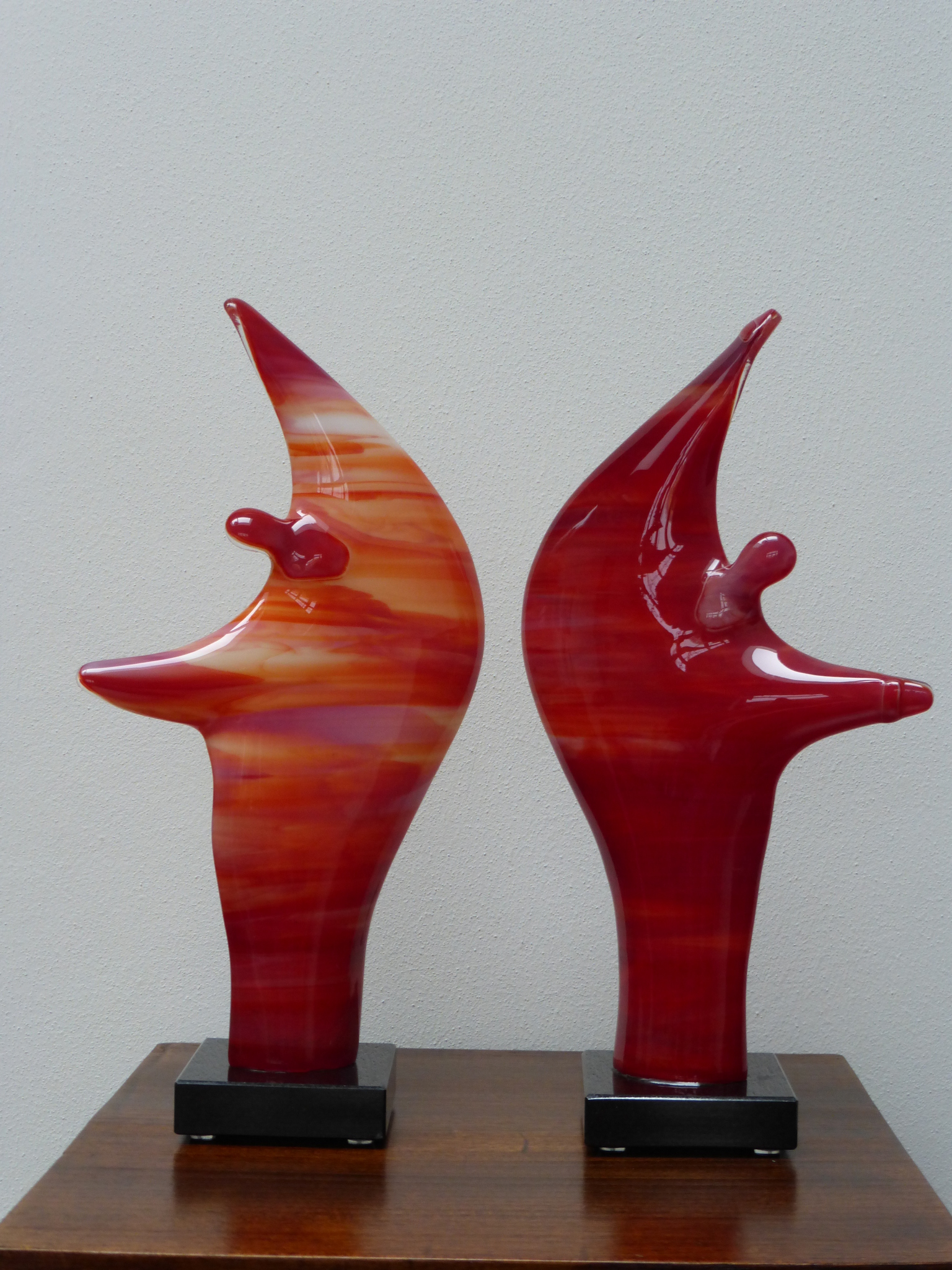 Twee lagen glas in elkaar gesmolten in de glasoven. Hierna de vlakke platen in de oven gevormd tot de 2 figuren over een mal.