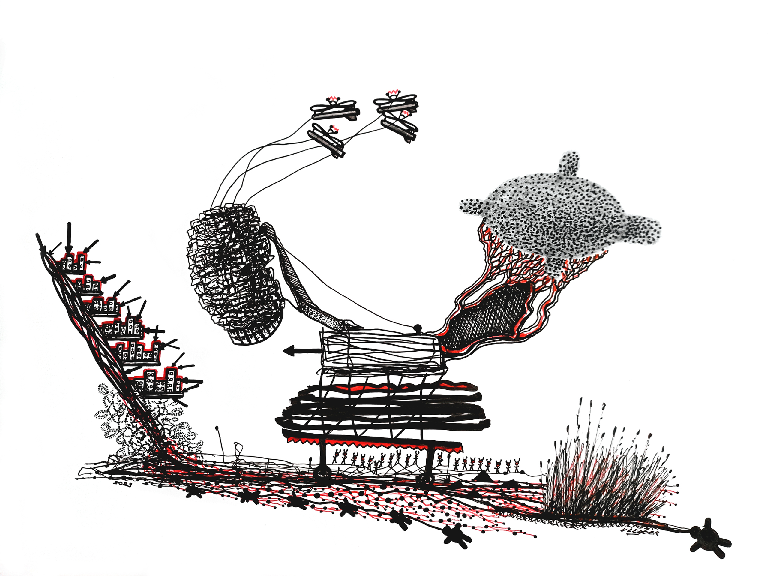 Belegering Oorlog Politiek Wereldtoneel Dubbelestandaard Kinderen Baby Mensen Doodenverderf Moord Oorlogsmisdaden Wegkijken Belangen Genocide Haatzaaien Mediamanipulatie Bombarderen Controleren Drones Vrijheid Fakedemocratie Democratie Kunst Tekening Inkt
