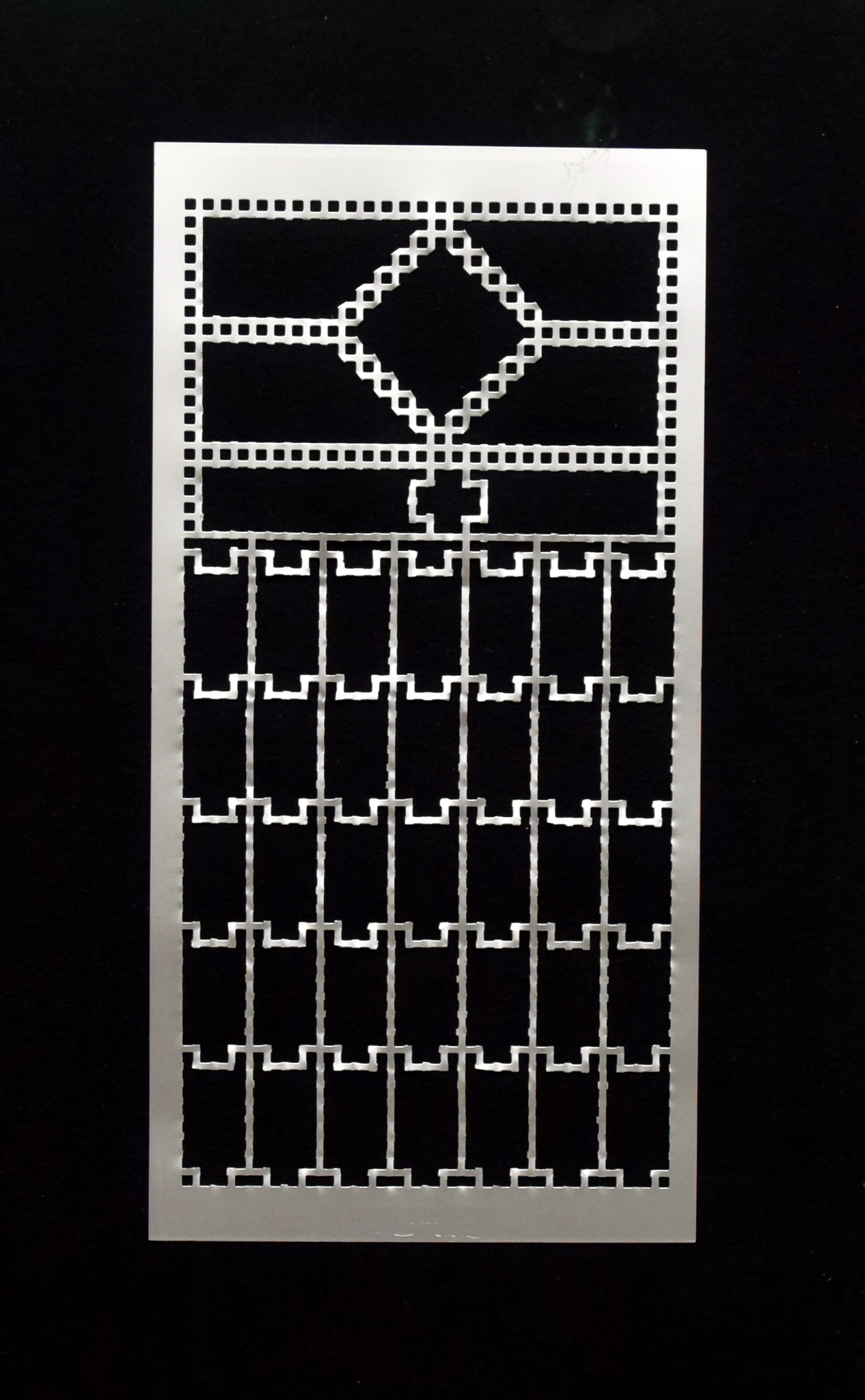Uitvoering: Zilverkleurig aluminium raster op roodsatijn paneel met witte baklijst.