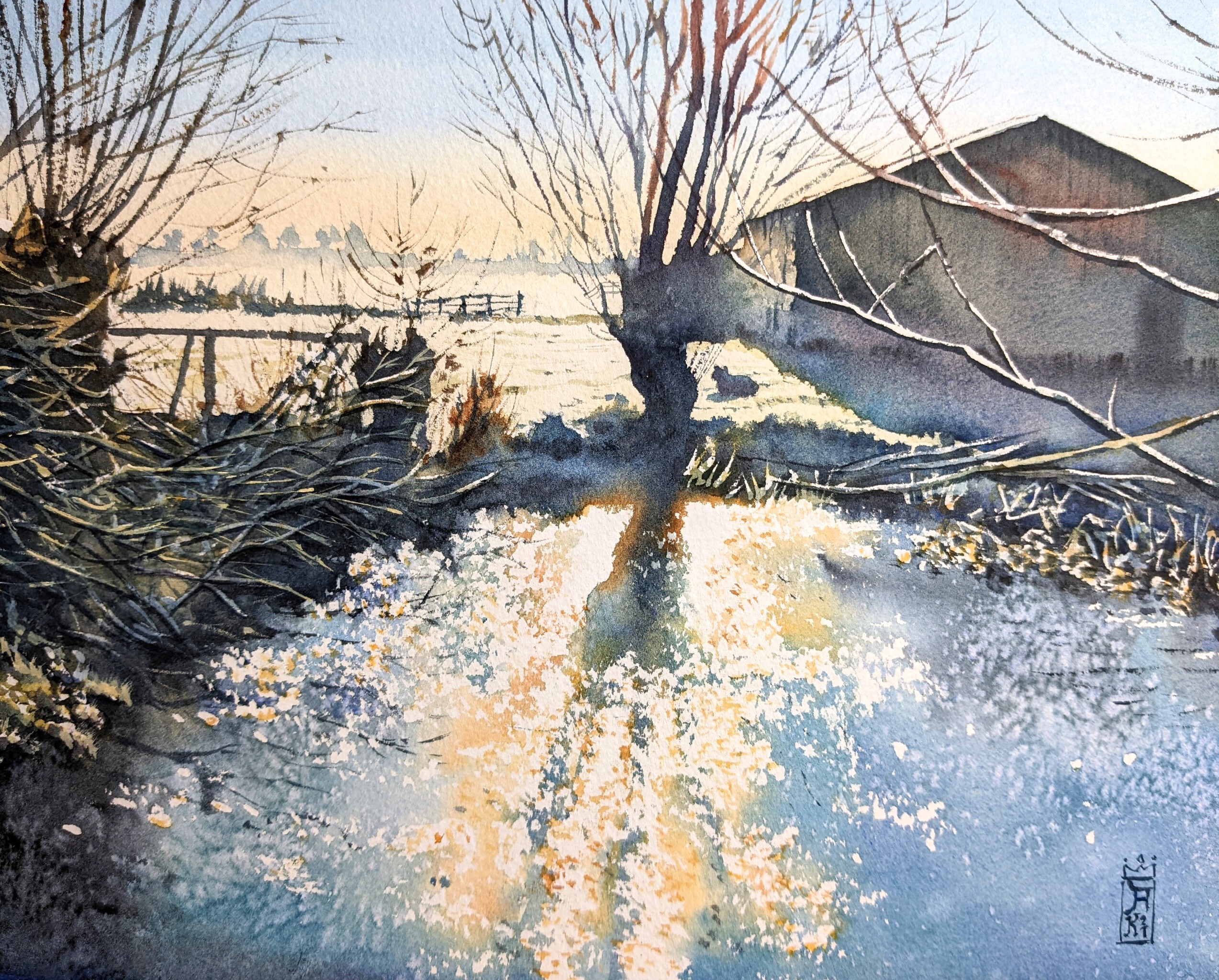 Licht Aquarel Realistisch Natuur Polder Winter Boom Watercolor Boerderij Farm Ijs Zonlicht Ice Nature Countryside Knotwilg Platteland Sunlight
