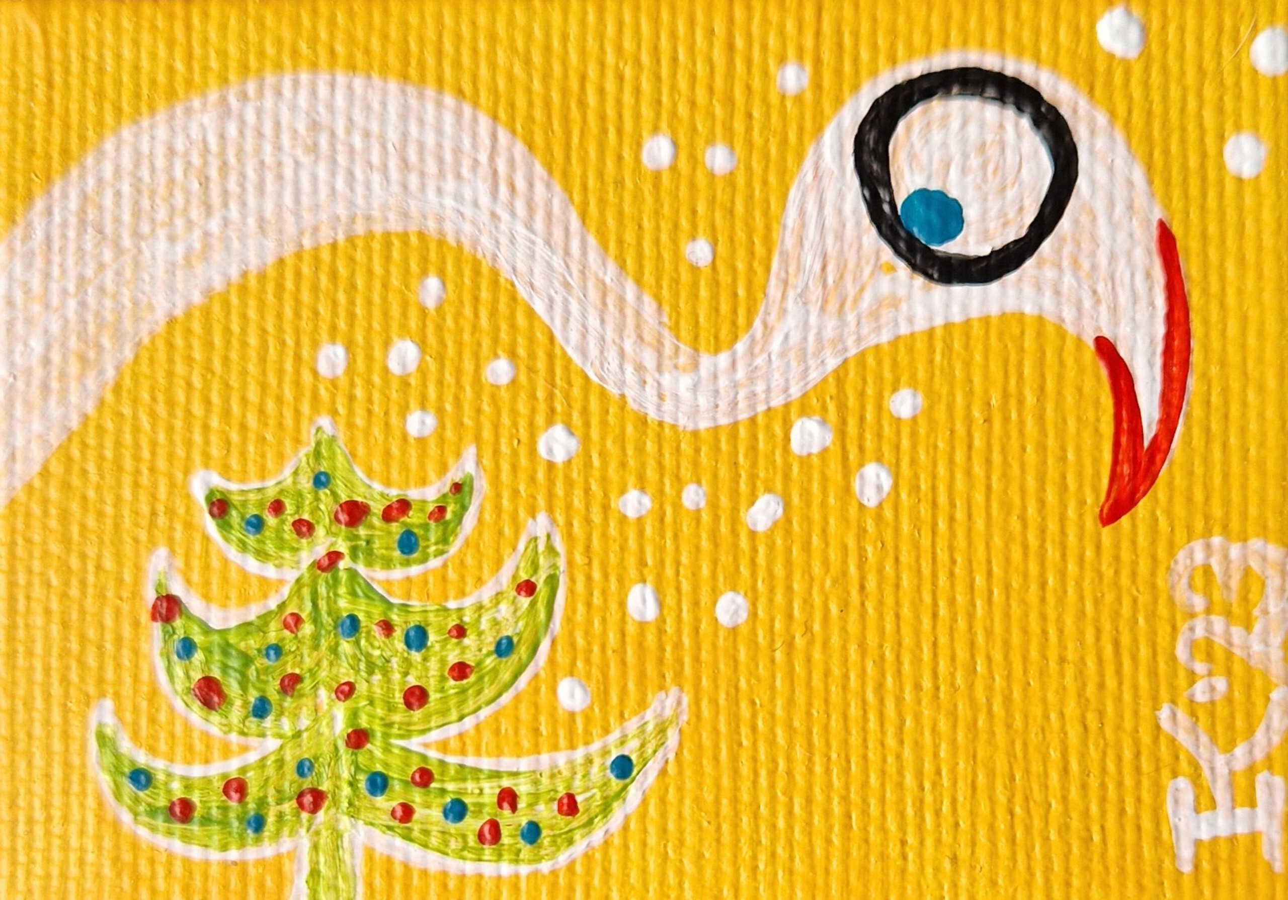 Decembercadeautje, verras jezelf of iemand anders met dit minischilderijtje, 5 bij 7 cm. Acrylverf op katoen, met een ophanghaakje aan de achterkant. November/december 2025; de prijs is inclusief decemberverpakking (rode achtergrond, met gouden sterretjes erop) en verzendkosten binnen Nederland (via Postnl).
