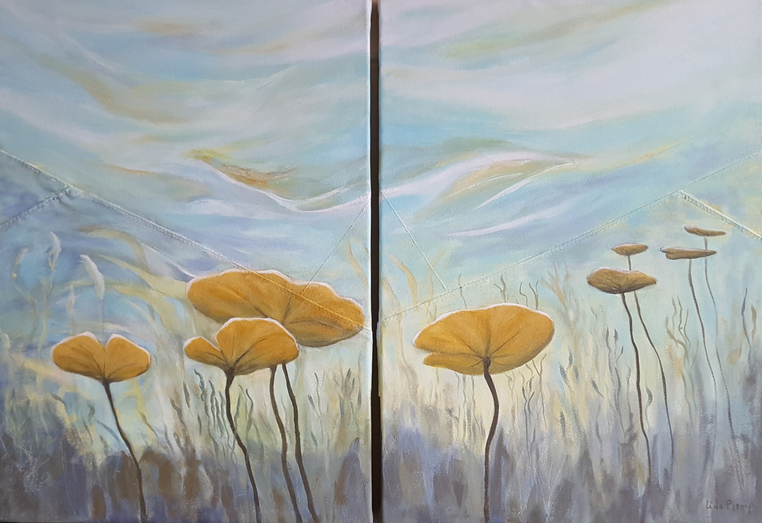 Tweeluik : Onder water, geschilderd op oud zeildoek.
