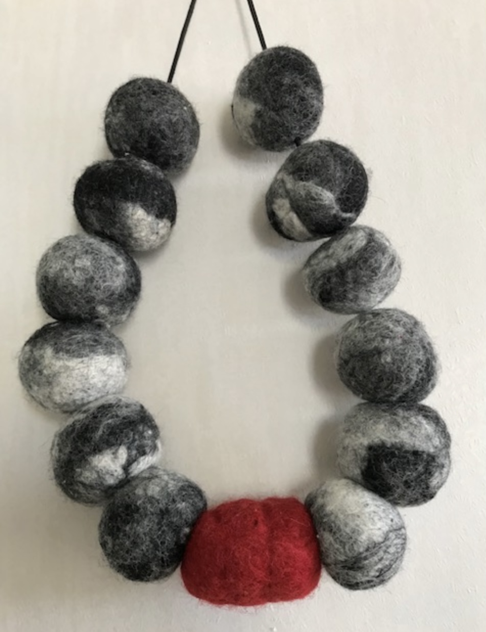 Deze ketting is licht van gewicht door het lichte materiaal waarmee de bollen gevuld zijn. De bollen zijn van wol.