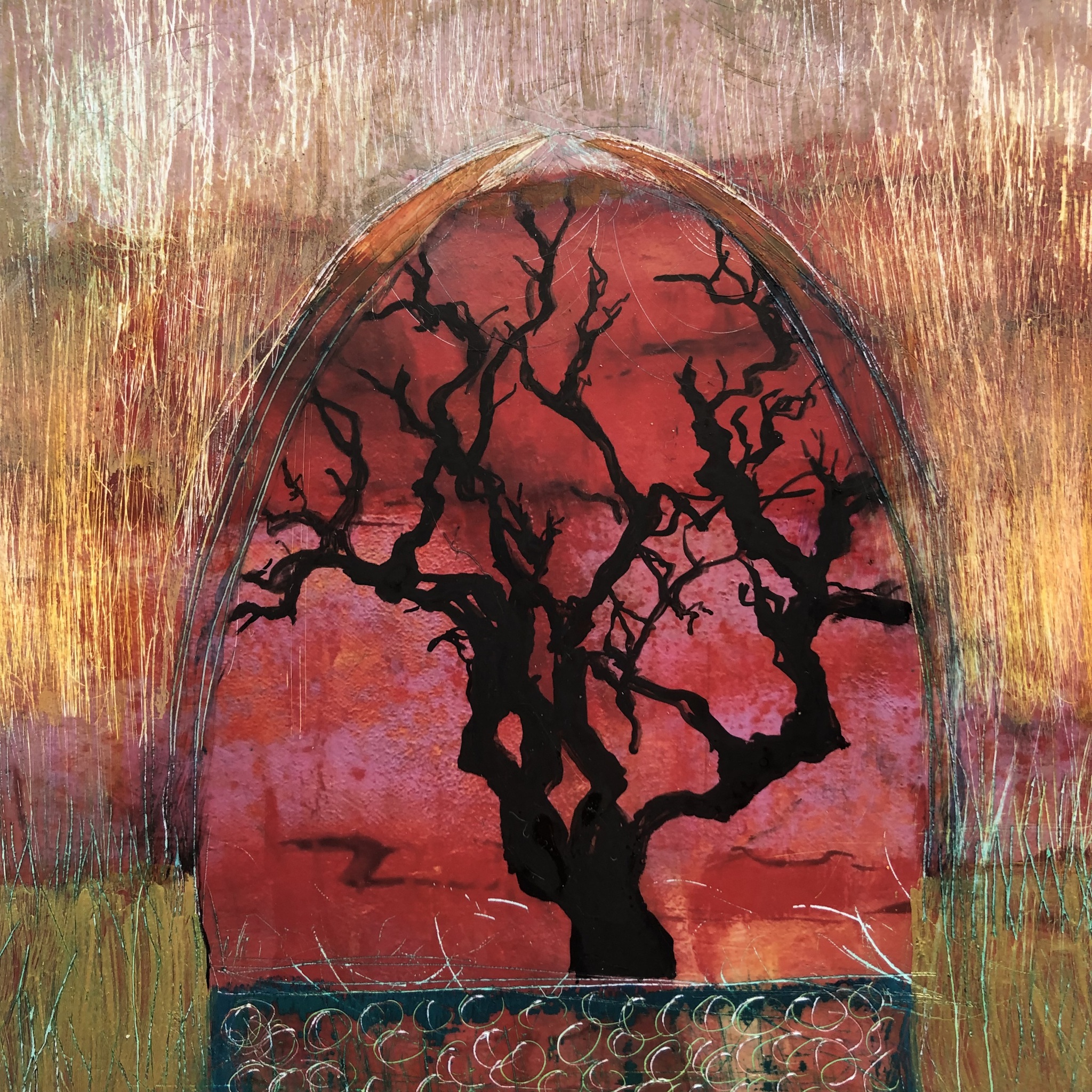In mijn werk maak ik gebruik van gemengde technieken en werk ik graag in lagen, al dan niet gebruikmakend van textuur. Ik houd ervan om onderlagen weer zichtbaar te maken en weer nieuwe lagen toe te voegen. Al doende groeit het beeld onder mij handen, letterlijk, omdat ik graag met mijn handen werk om te bereiken wat ik wil.