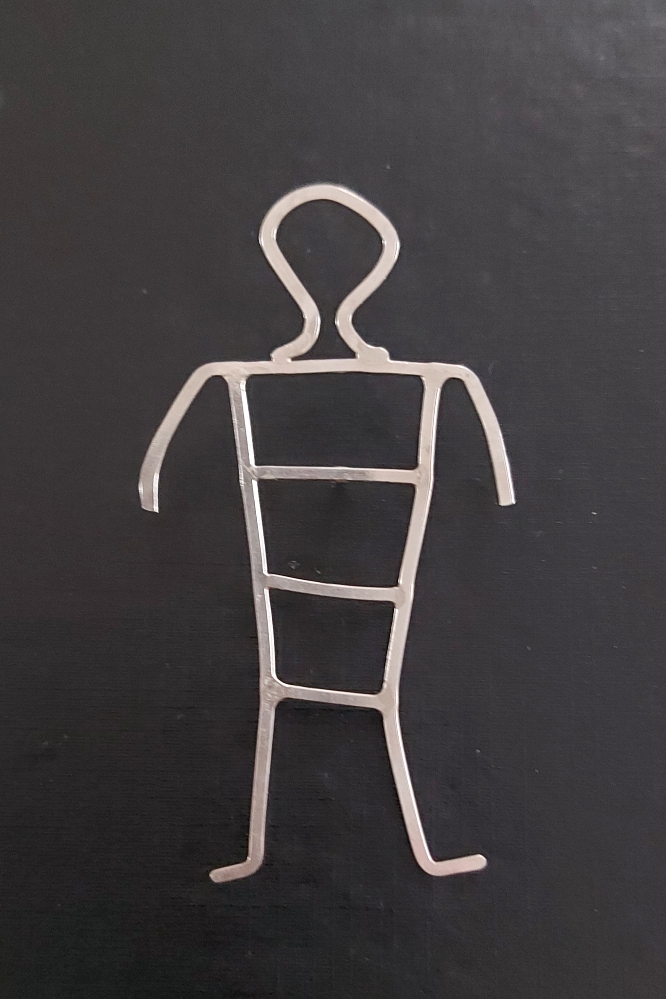 Zilveren mannetje gemaakt. N.a.v. rotstekening in Australie.