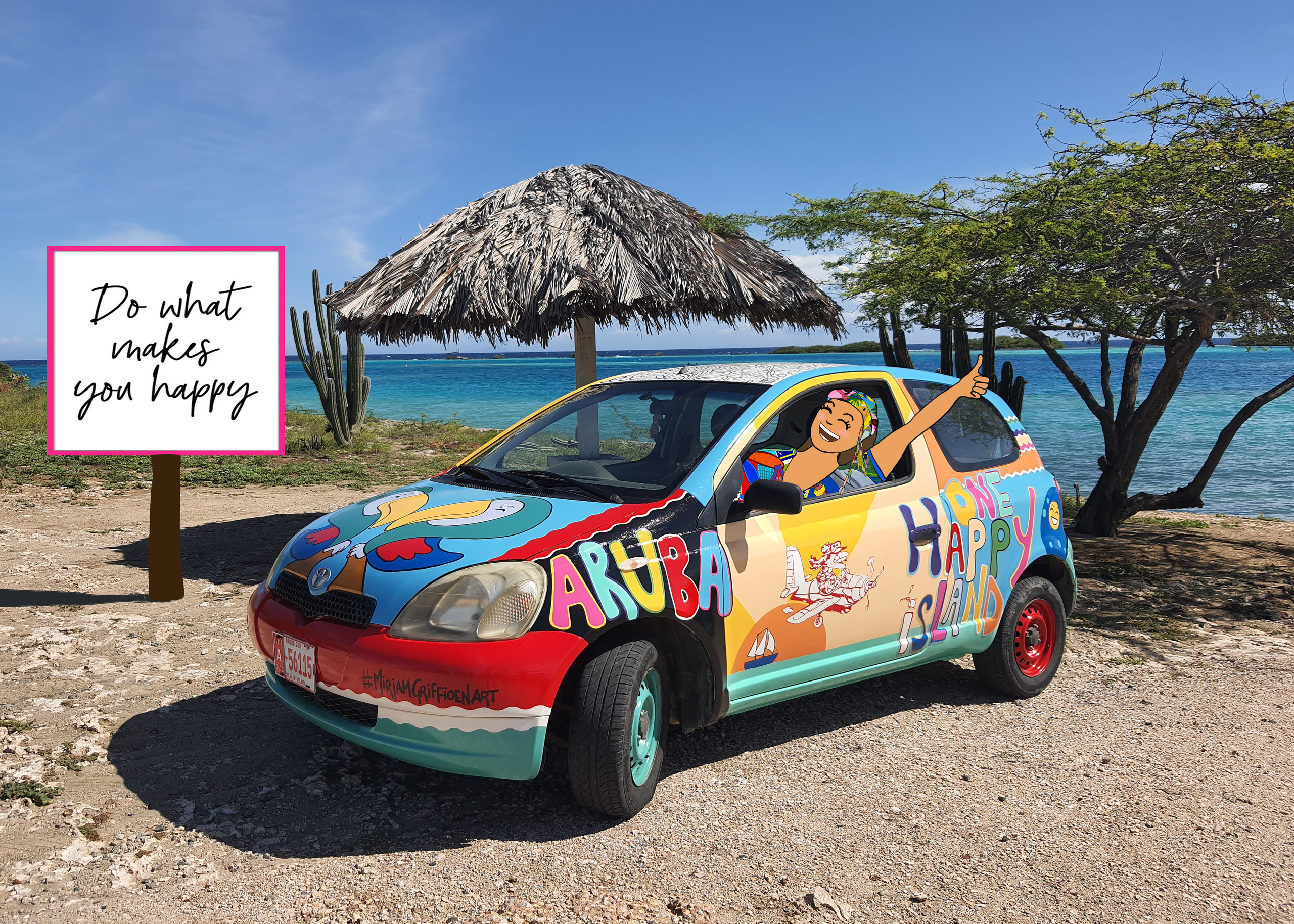 Paintedcar Auto Happiness Happy Art Caribbeanart Aruba Blij Geschilderdeauto Beachgirl Summer Toerisme Islandart Caribbean Caribbeanartist Mirjamgriffioenart