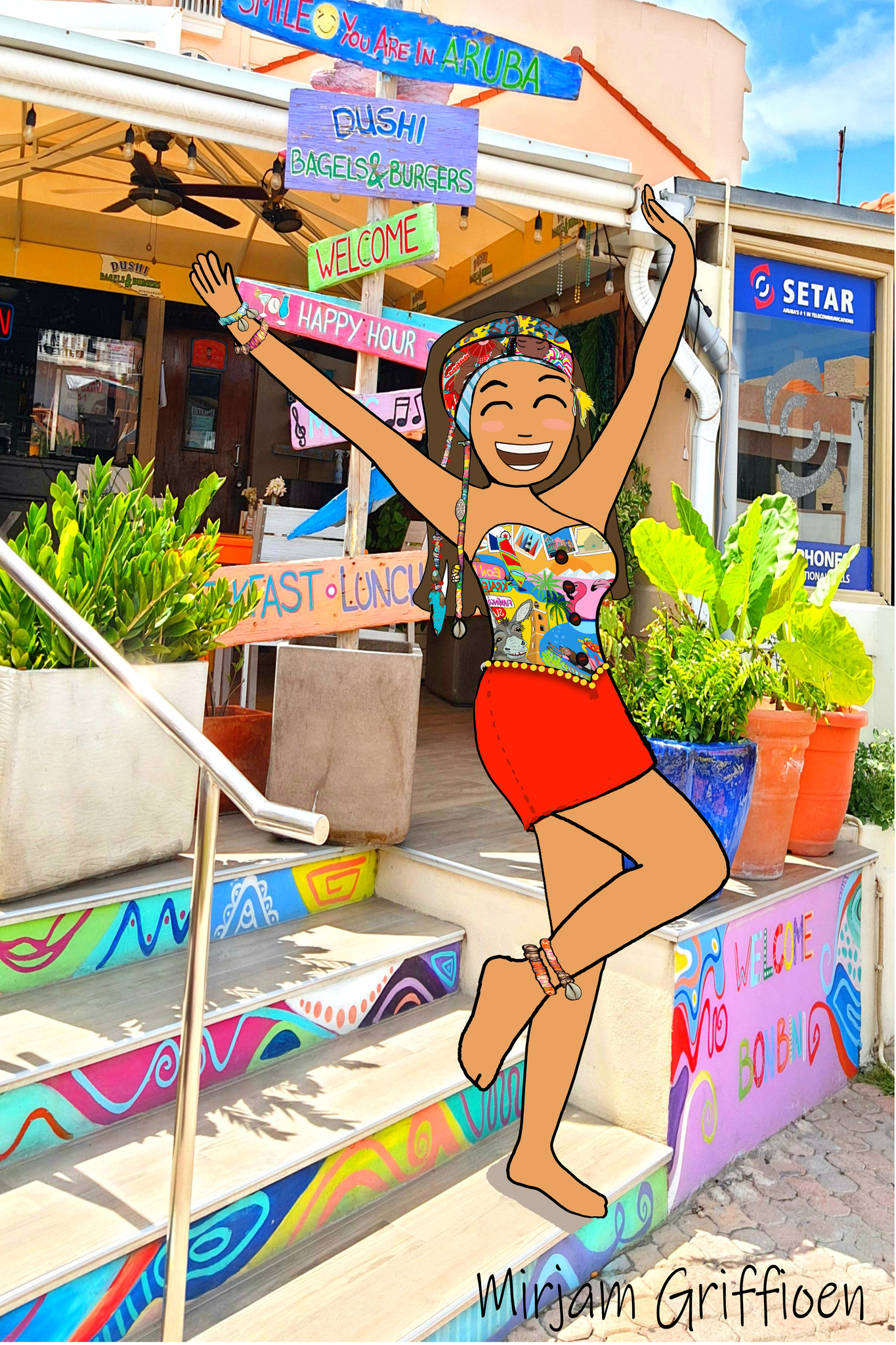 Vrolijk Eiland Surfgirl Surf Shopping Winkelen Blij Vrouw Mirjamgriffioenart Caribbean Caribbeanart Caribbeanartist Islandlife Summer Aruba Beach Shop Happyart Colorfulart Fashion