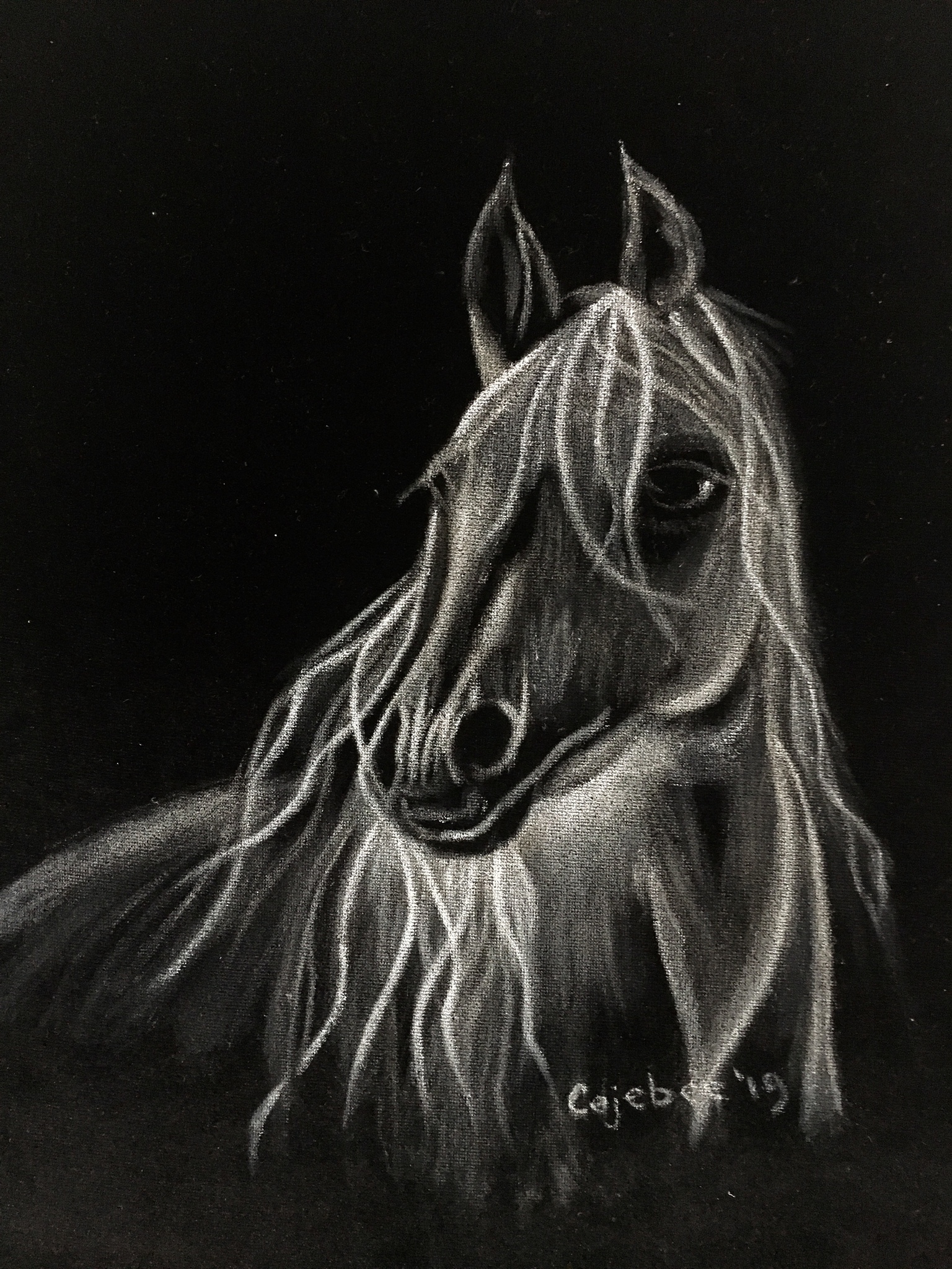 Om het niet te verleren, deed ik het nog een keer, een iets ander paard met acryl verf schilderen op het zwarte doek.