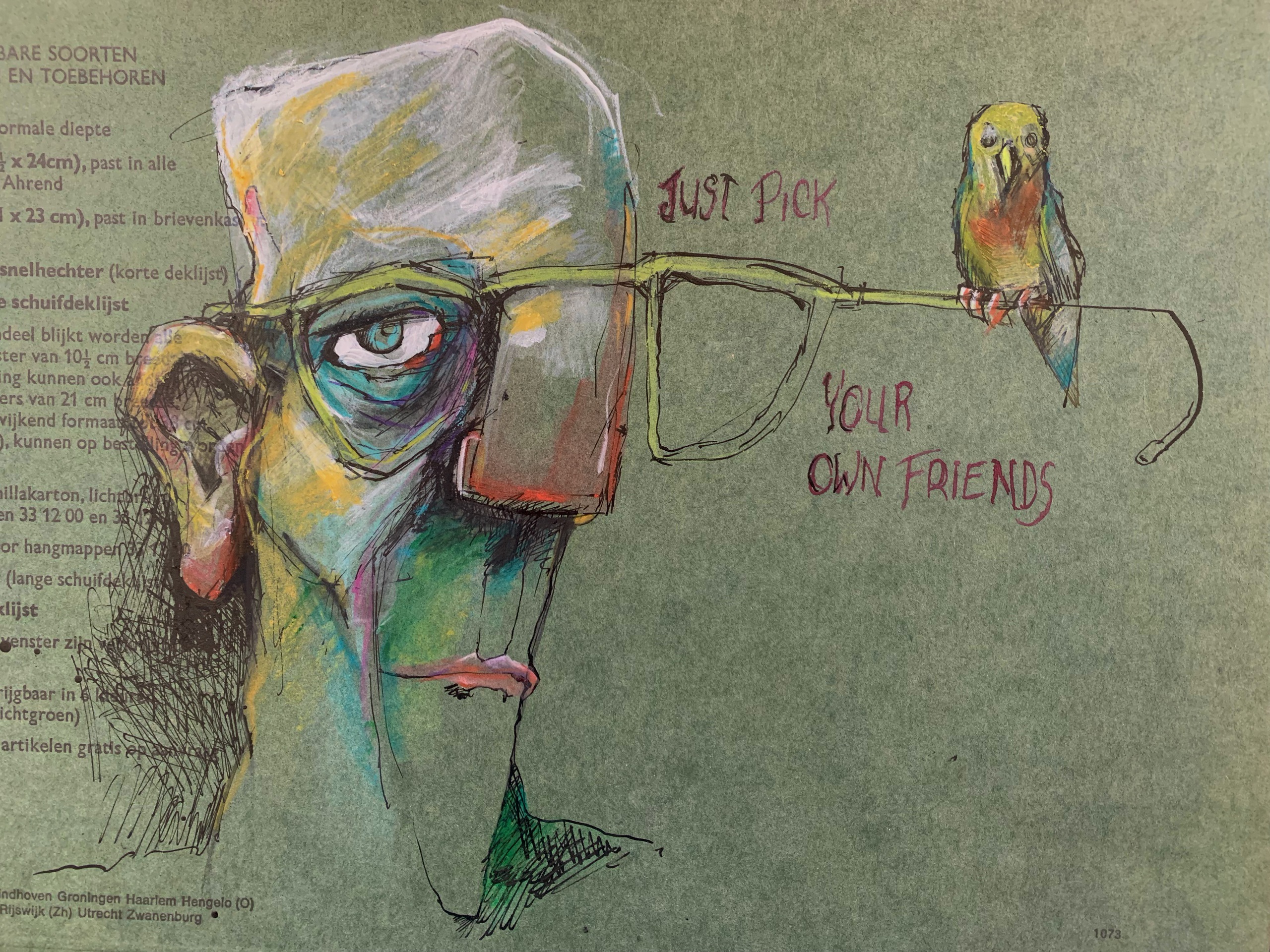 Bril Vogel Vriend Tekst Papier Karton Tekening Pen Ecolint Pastel Krijt Acrylverf Potlood