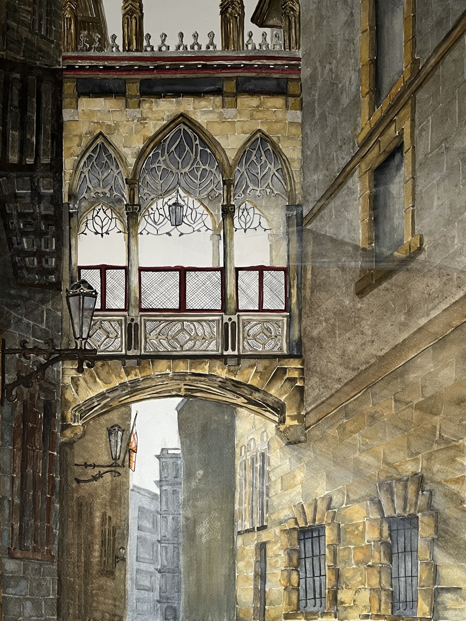 Aquarel 63x47 Fabriano 300 gr. Brug over de Bisschopstraat in de Gotische wijk (oude centrum) van Barcelona