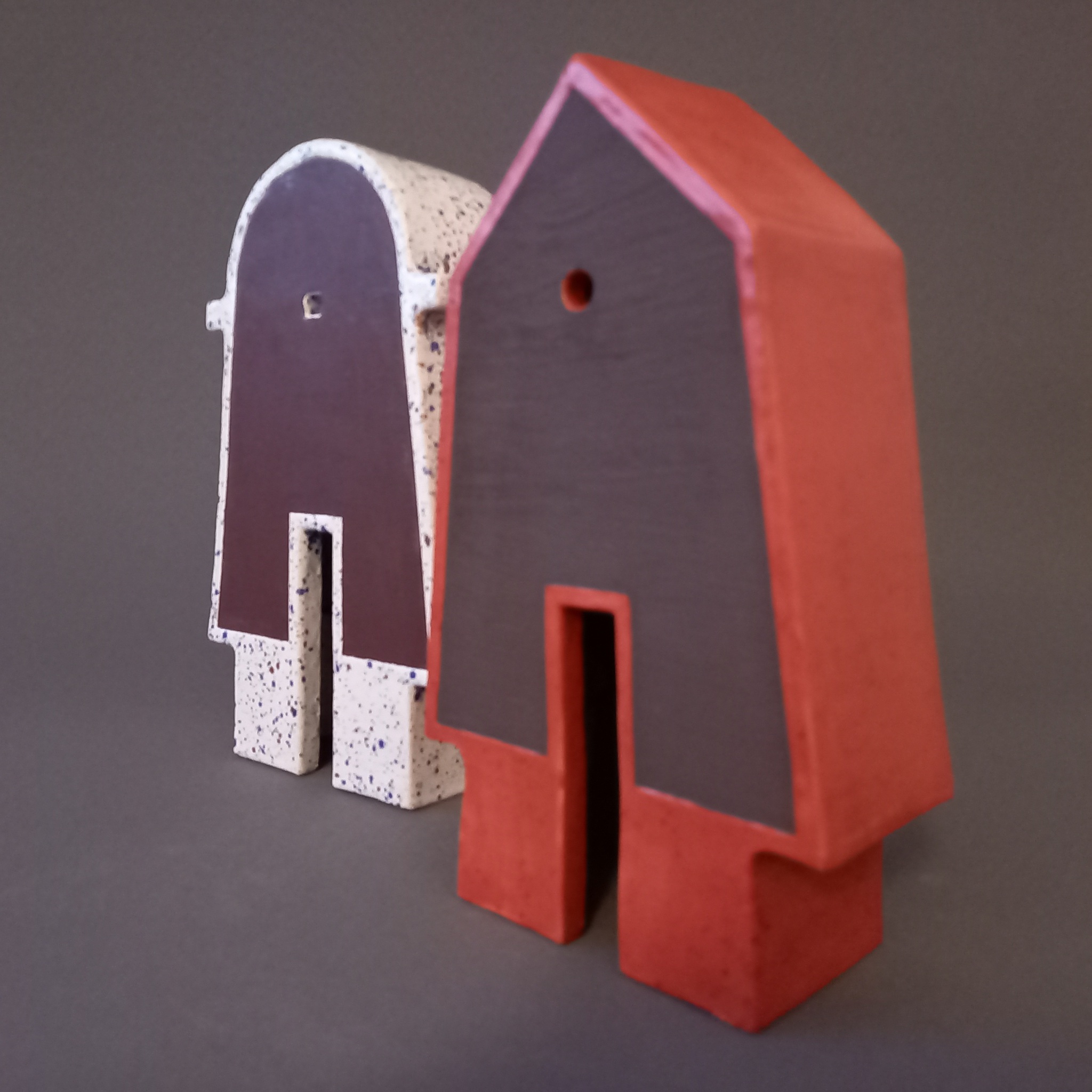 Twee huizen. Een met een "Mansardekap" en een met een "Molenprofiel". Witte klei, glazuur en ijzeroxide (zwarte en rode)